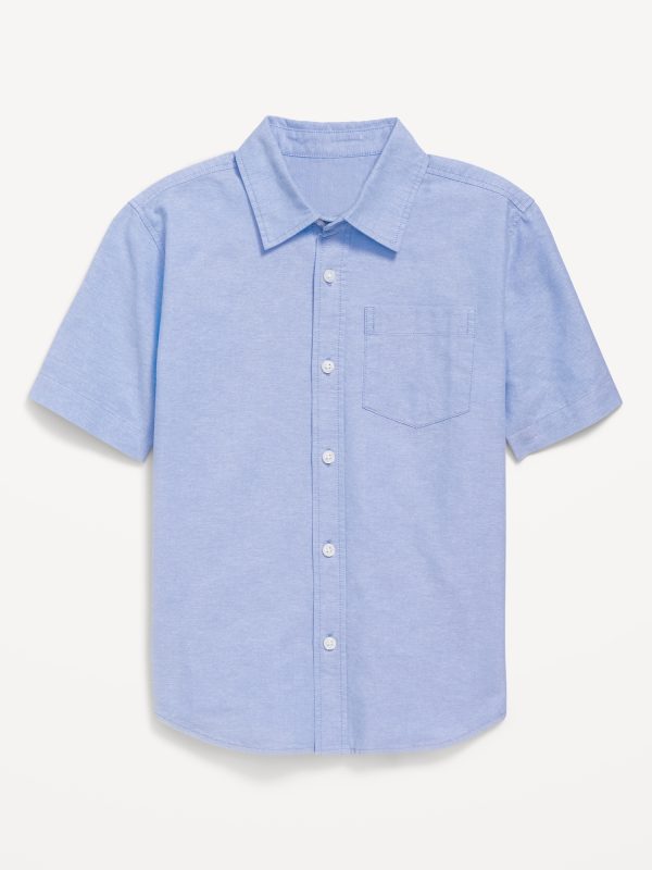 Short-Sleeve Oxford Shirt for Boys: spread collar, short sleeves, patch pocket at chest, full-length buttoned placket, all-over print, #865930