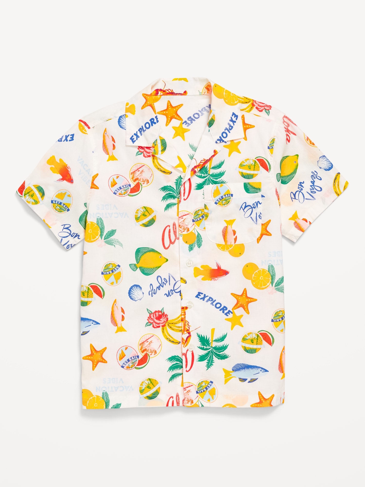 Short-Sleeve Poplin Shirt for Boys: spread collar, short sleeves, full-length buttoned placket, patch pocket at chest, all-over pattern, #586641