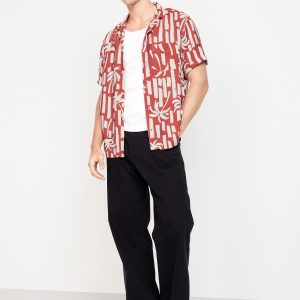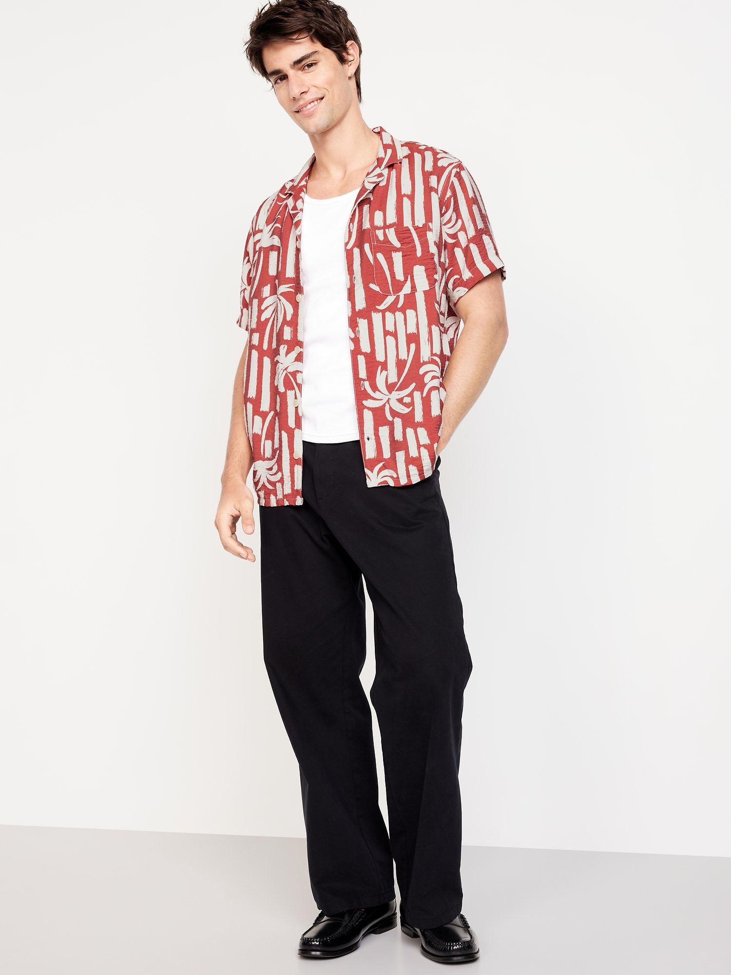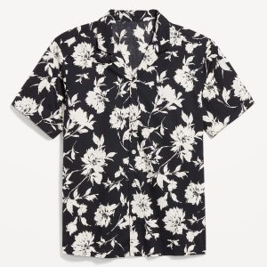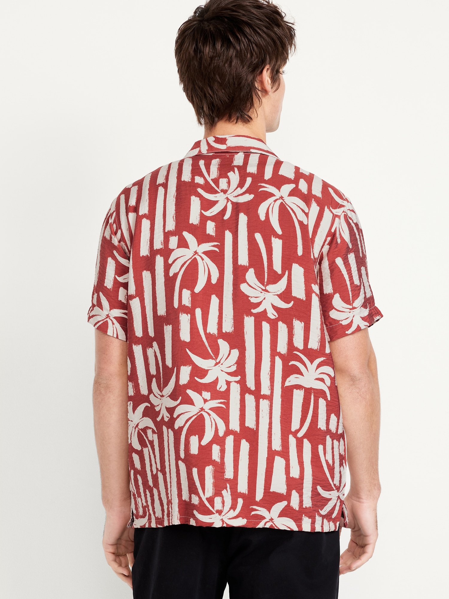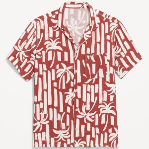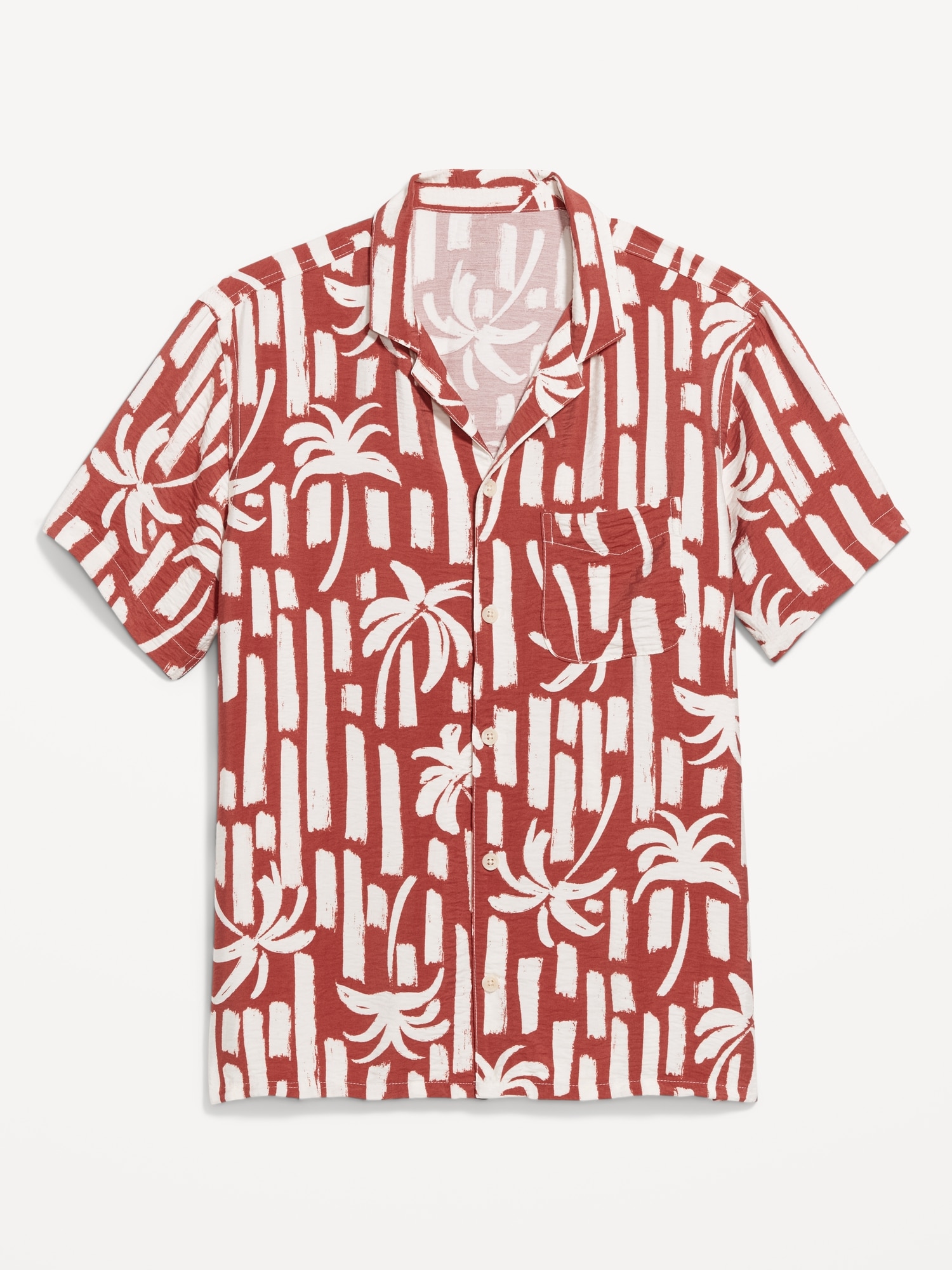 Short-Sleeve Printed Camp Shirt: notched collar, short sleeves, full-button front, vertical striped print, #762762
