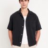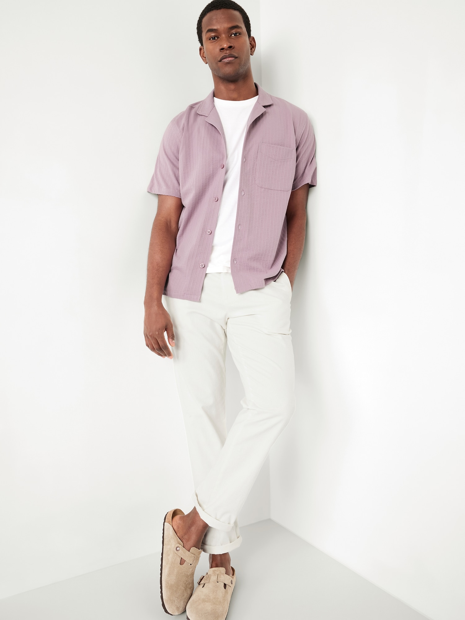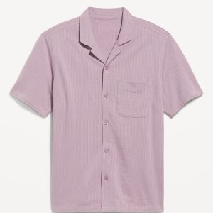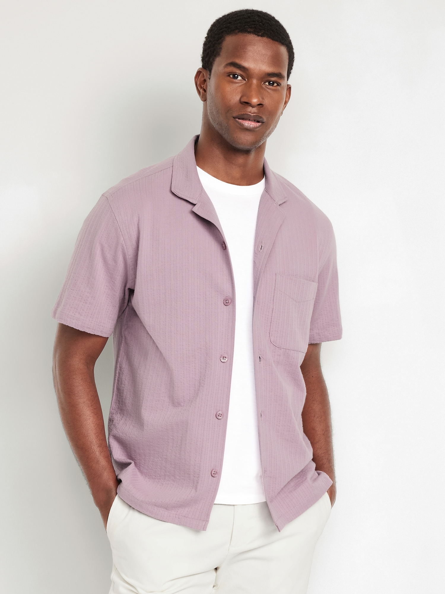 Short-Sleeve Seersucker Camp Shirt: notched collar, short sleeves, patch chest pocket, full-button front, vented sides, #762062