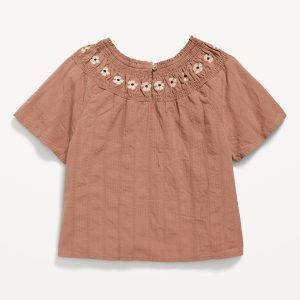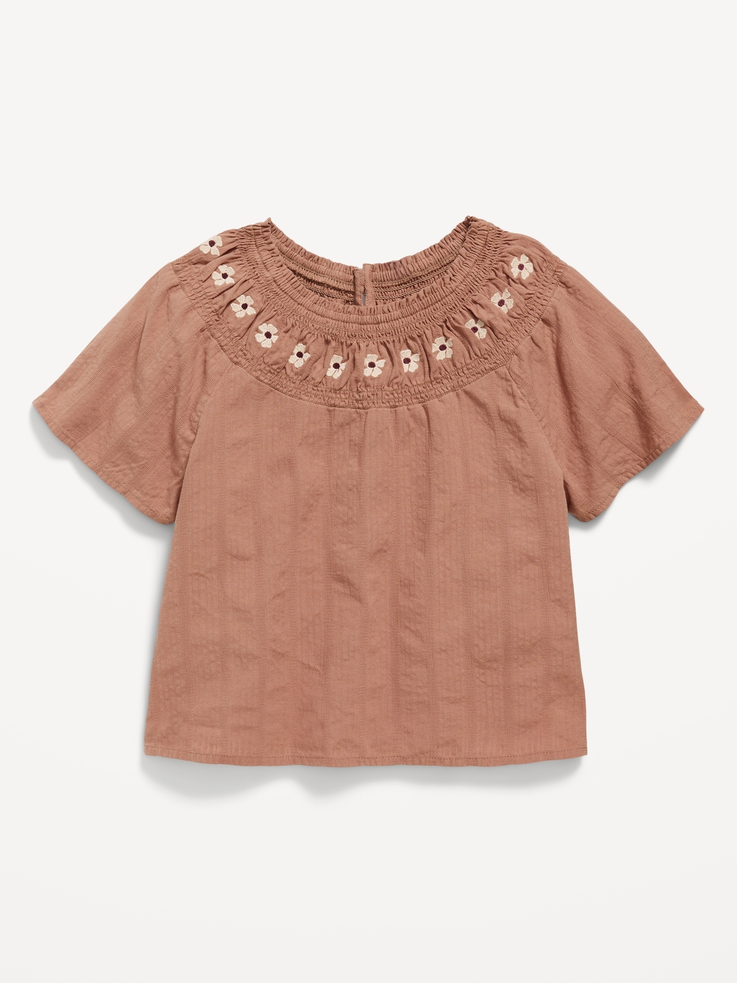 Short-Sleeve Textured Embroidered Top for Girls: smocked neckline, keyhole cutout with button loop closure at nape, embroidered floral pattern along neck, short sleeves, #806079