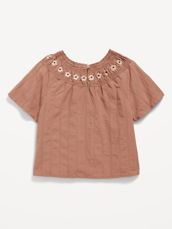 Short-Sleeve Textured Embroidered Top for Girls: smocked neckline, keyhole cutout with button loop closure at nape, embroidered floral pattern along neck, short sleeves, #806079