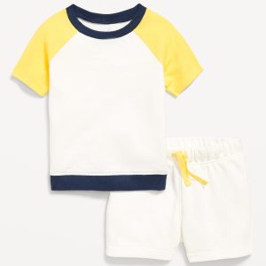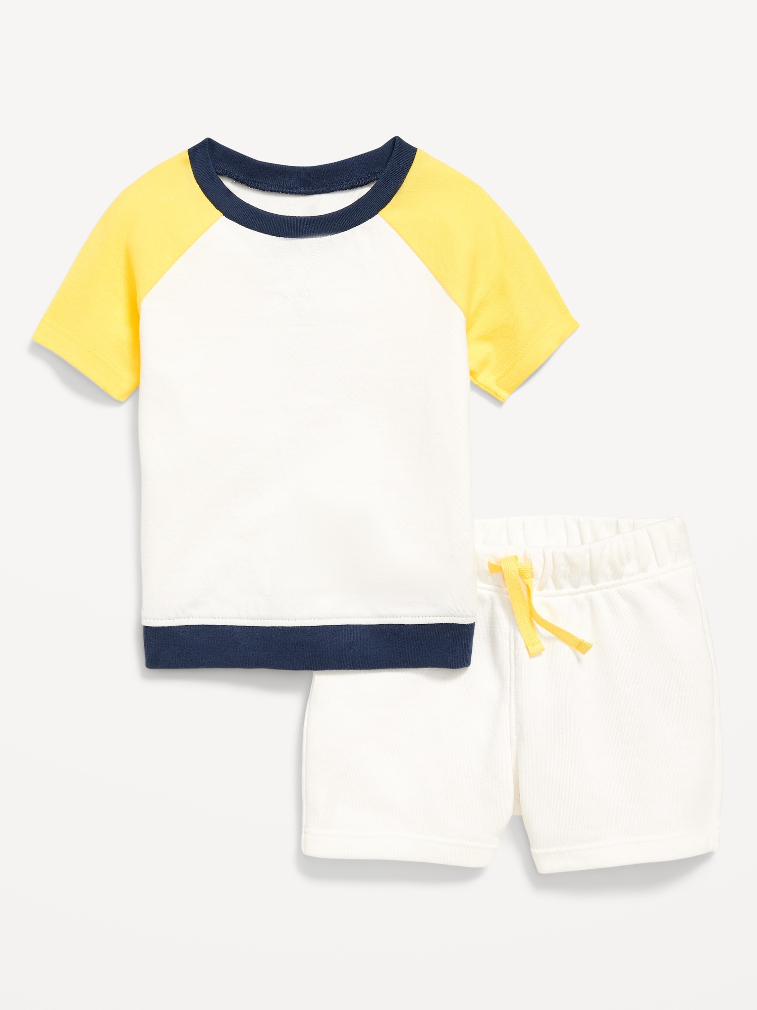Short-Sleeve Top and Shorts Set for Baby: crew neck, short rolled sleeves, graphic at front, coordinating shorts, elasticized waistband, functional drawstring, all-over stripes, #761909