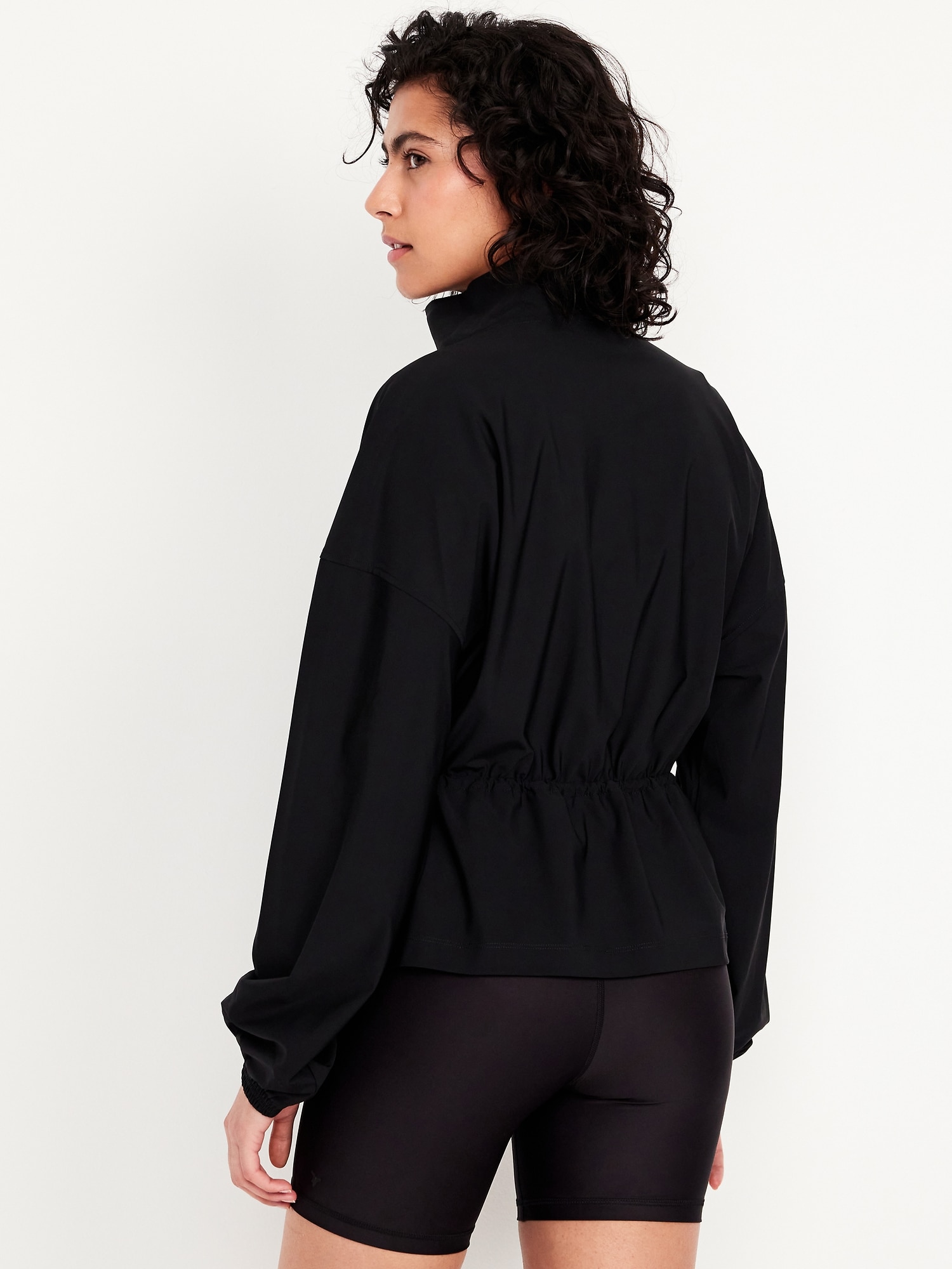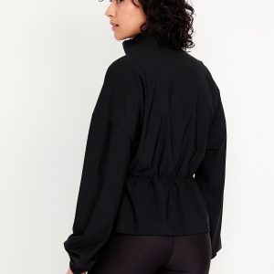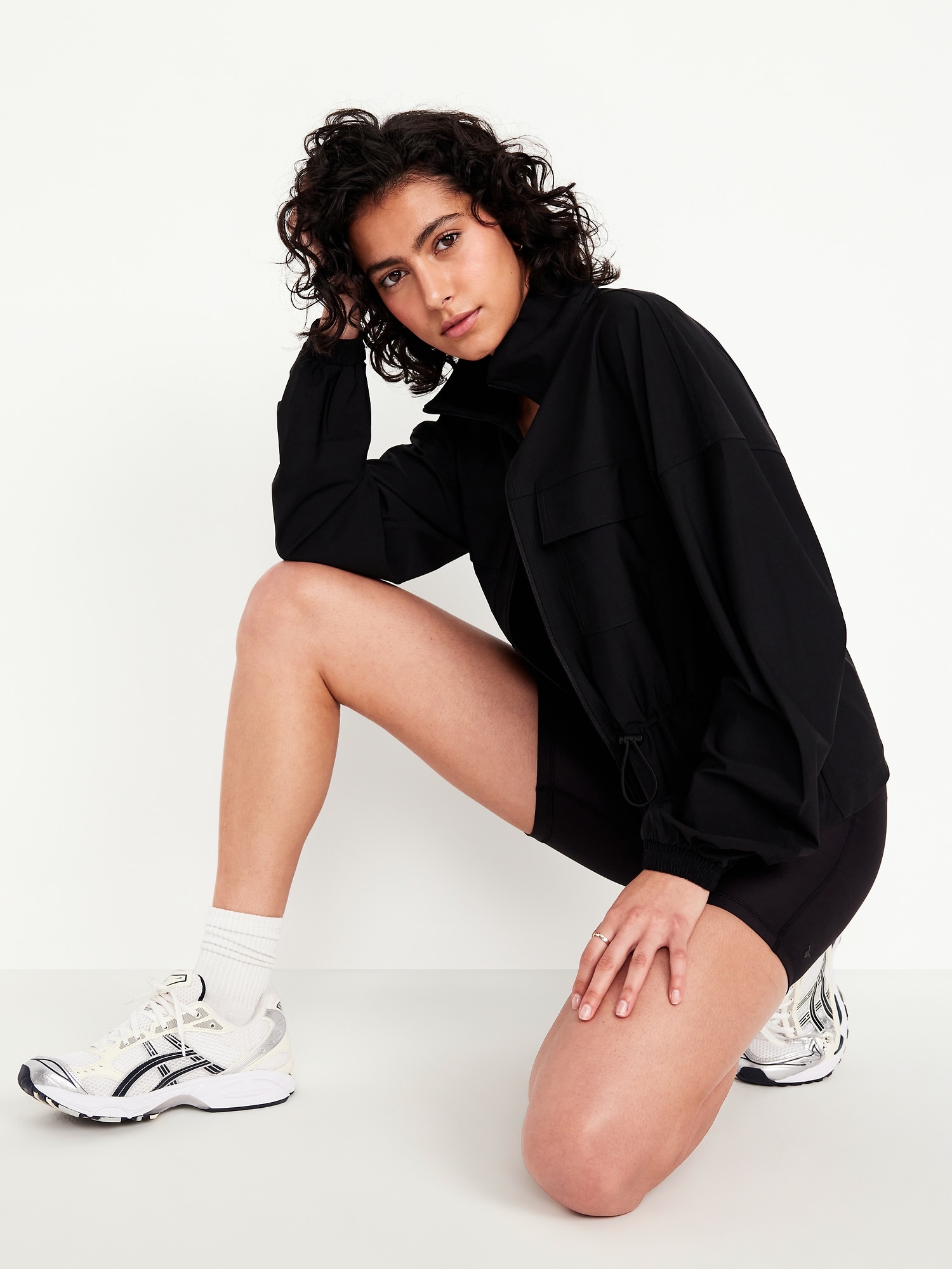 SleekTech Oversized Cinched-Waist Jacket: Featuring SleekTech. Polished and lightweight, with serious stretch.mock neck, long sleeves with elastic cuffs, full-zip front, flap chest pockets, cinched drawcord waist, go-dry wicks moisture, #766347