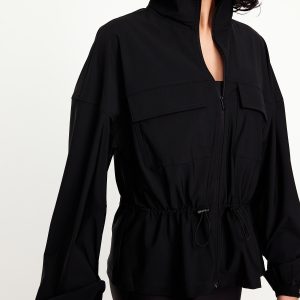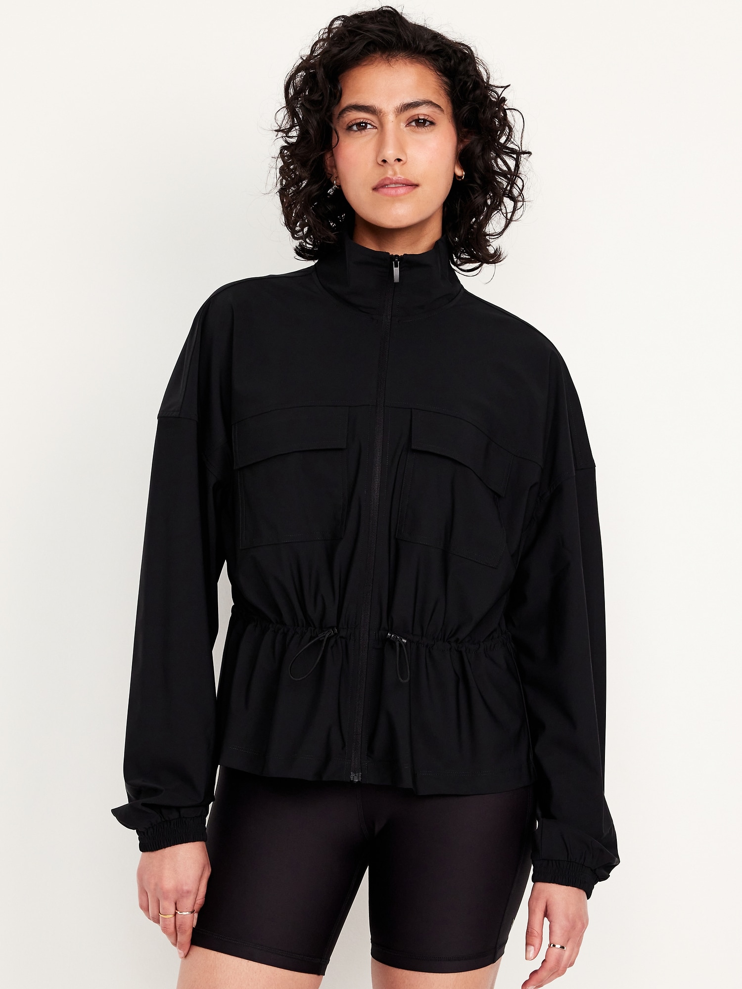 SleekTech Oversized Cinched-Waist Jacket: Featuring SleekTech. Polished and lightweight, with serious stretch.mock neck, long sleeves with elastic cuffs, full-zip front, flap chest pockets, cinched drawcord waist, go-dry wicks moisture, #766347