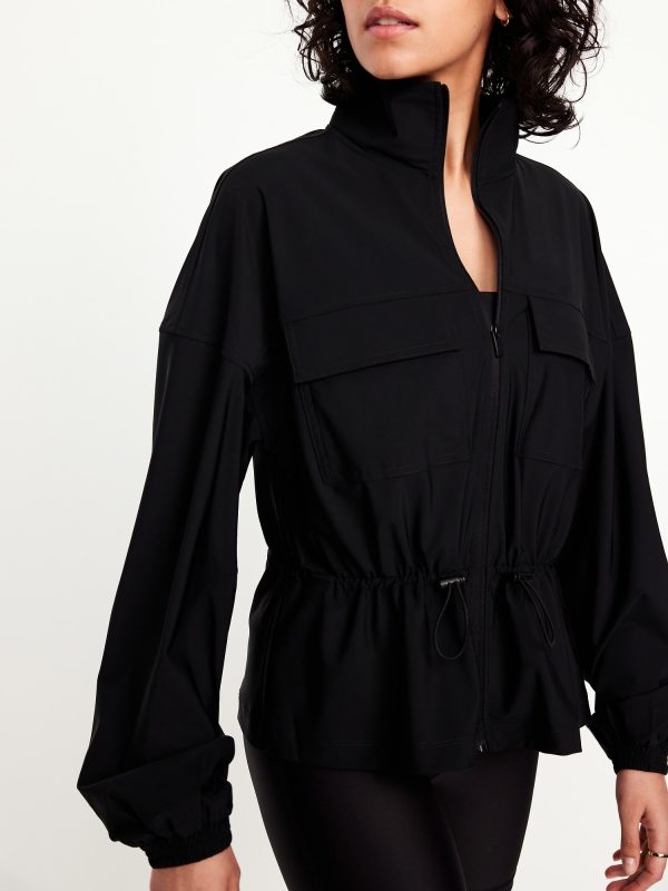 SleekTech Oversized Cinched-Waist Jacket: Featuring SleekTech. Polished and lightweight, with serious stretch.mock neck, long sleeves with elastic cuffs, full-zip front, flap chest pockets, cinched drawcord waist, go-dry wicks moisture, #766347