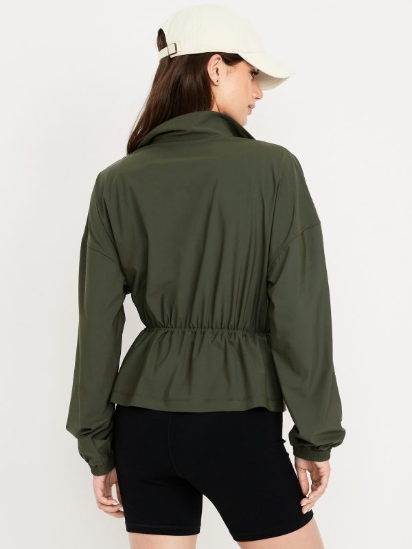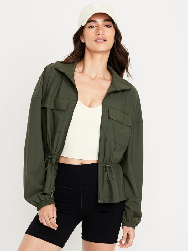 SleekTech Oversized Cinched-Waist Jacket: Featuring SleekTech. Polished and lightweight, with serious stretch.mock neck, long sleeves with elastic cuffs, full-zip front, flap chest pockets, cinched drawcord waist, go-dry wicks moisture, #766347