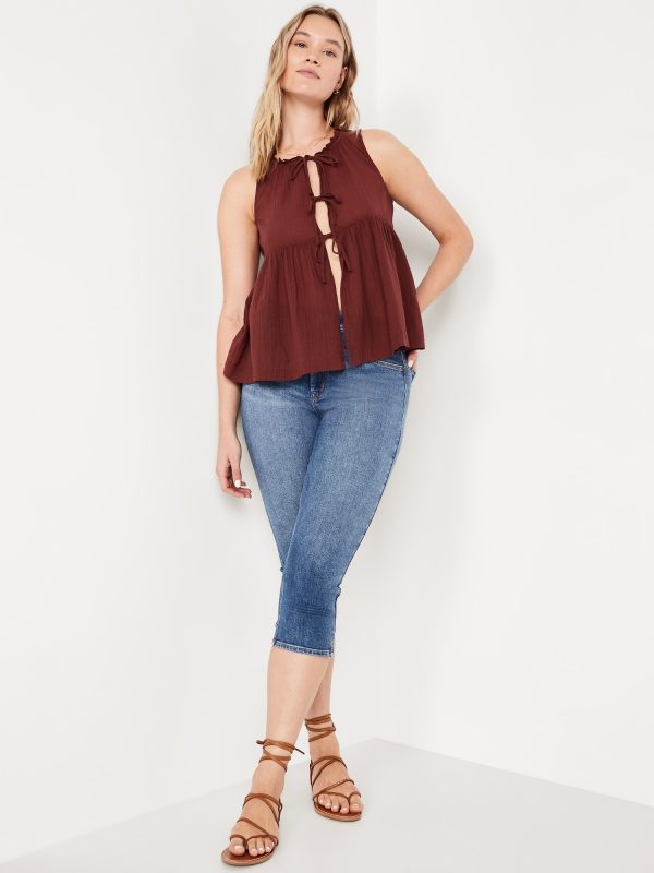 Sleeveless Crinkle Gauze Tie-Front Top: ruffled neck, sleeveless, tie-front detail, seamed empire waist, split center front, #764189