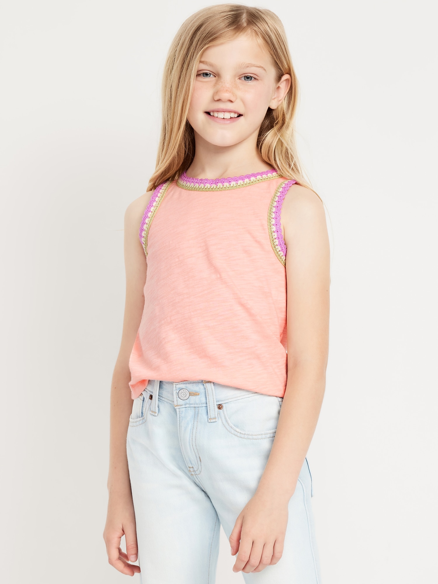 Sleeveless Crochet-Trim Top for Girls: round neckline, sleeveless, button closure and keyhole cutout at nape, crochet knit trim along neckline and sleeve cuffs, rounded hem, #767961