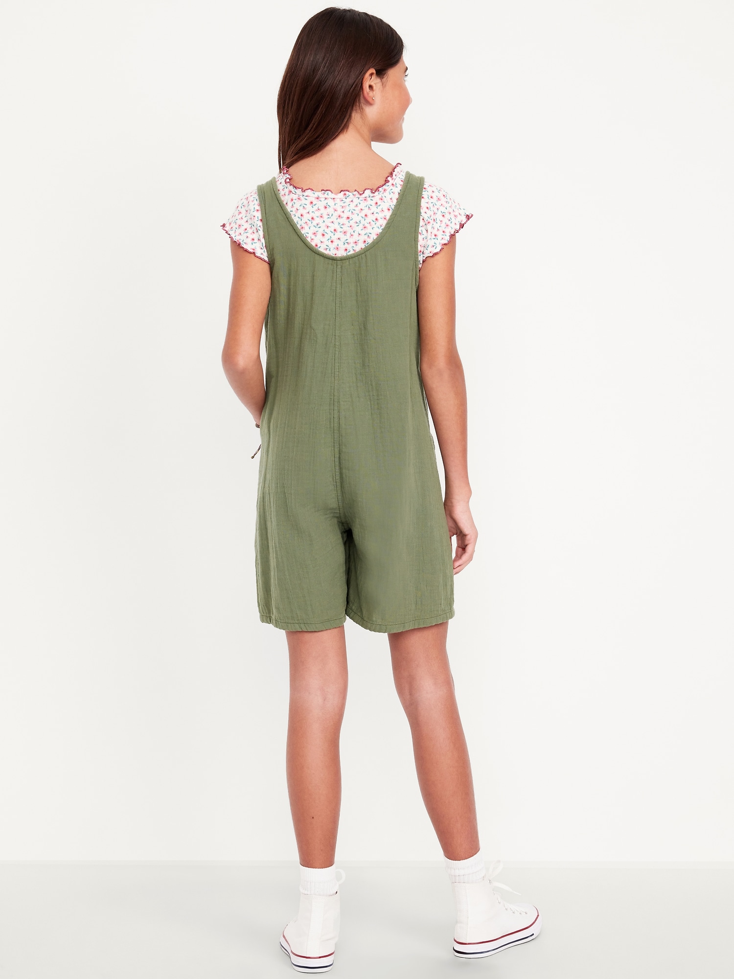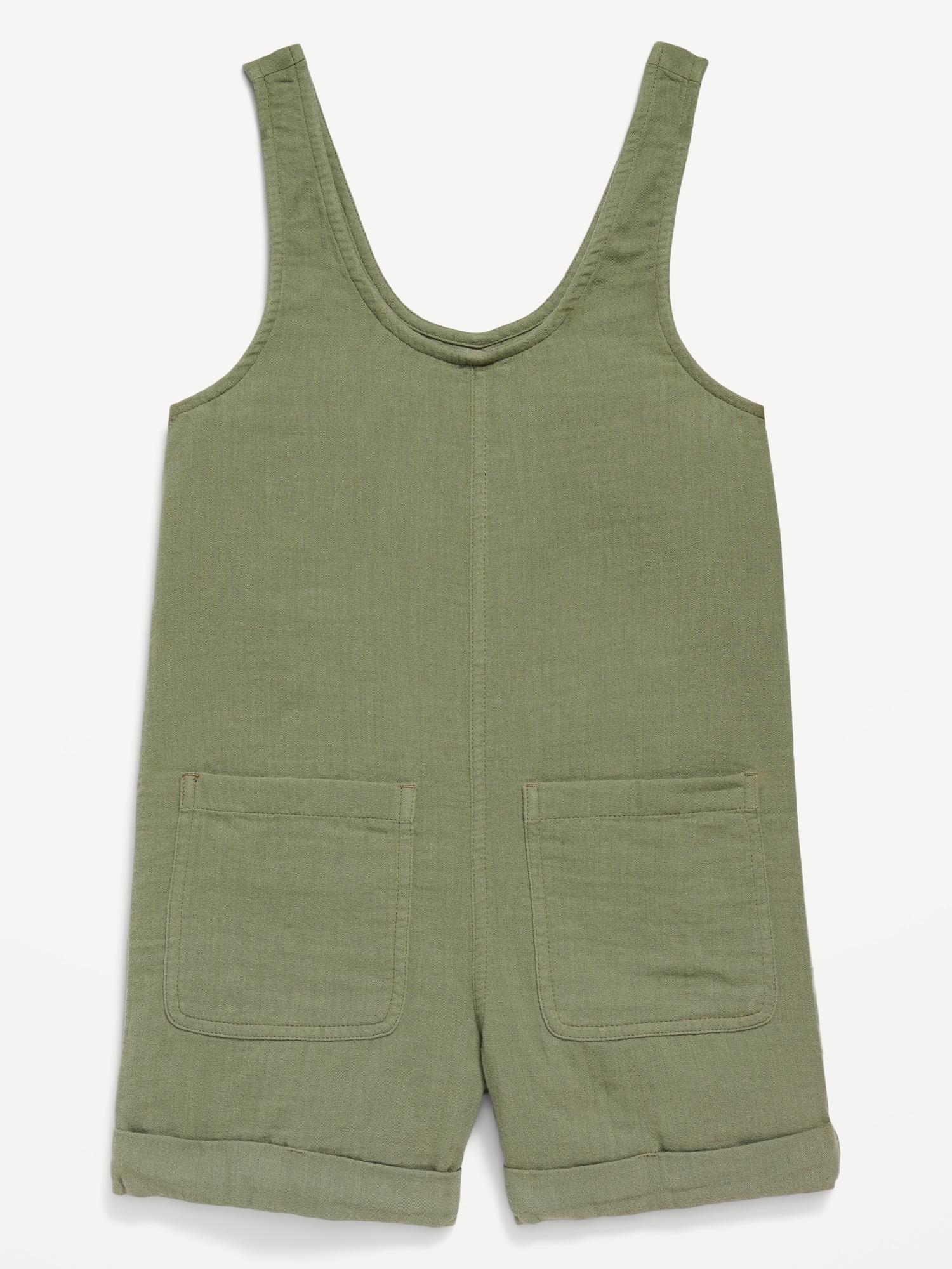 Sleeveless Double-Weave Pocket Romper for Girls: deep scoop neck, sleeveless, patch pockets at front, rolled leg cuffs, #766632