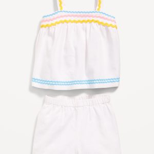 Sleeveless Linen-Blend Top and Shorts Set for Toddler Girls: wide straps, contrasting zig-zag trim, elastic-waist shorts, #767010