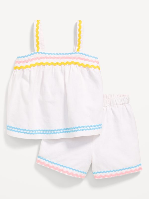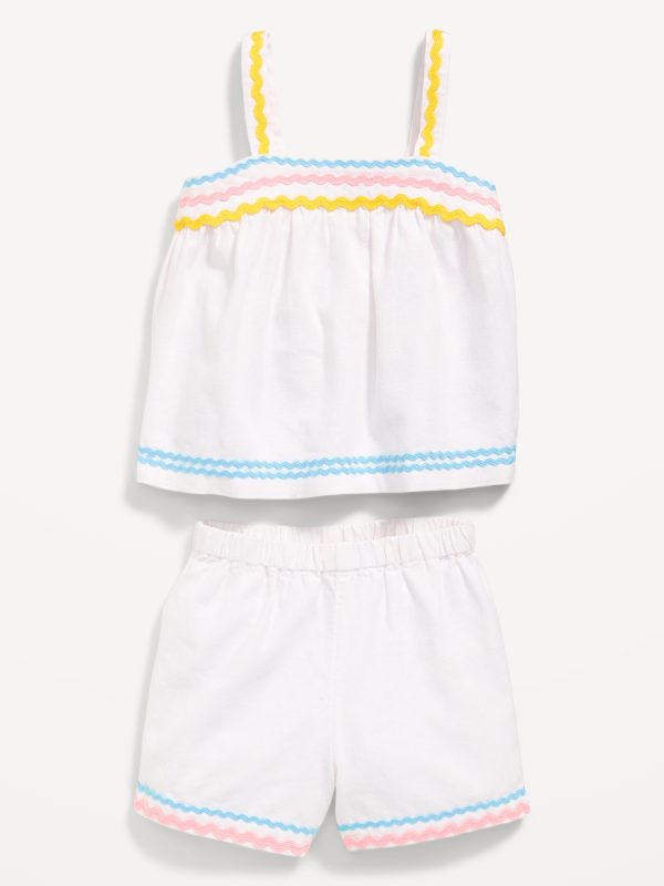 Sleeveless Linen-Blend Top and Shorts Set for Toddler Girls: wide straps, contrasting zig-zag trim, elastic-waist shorts, #767010