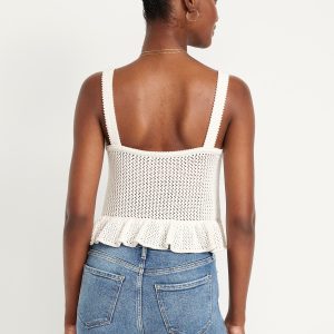 Sleeveless Open-Stitch Peplum Sweater: scoop neck, wide straps, floral appliqué accents, ruffled peplum hem, #761610