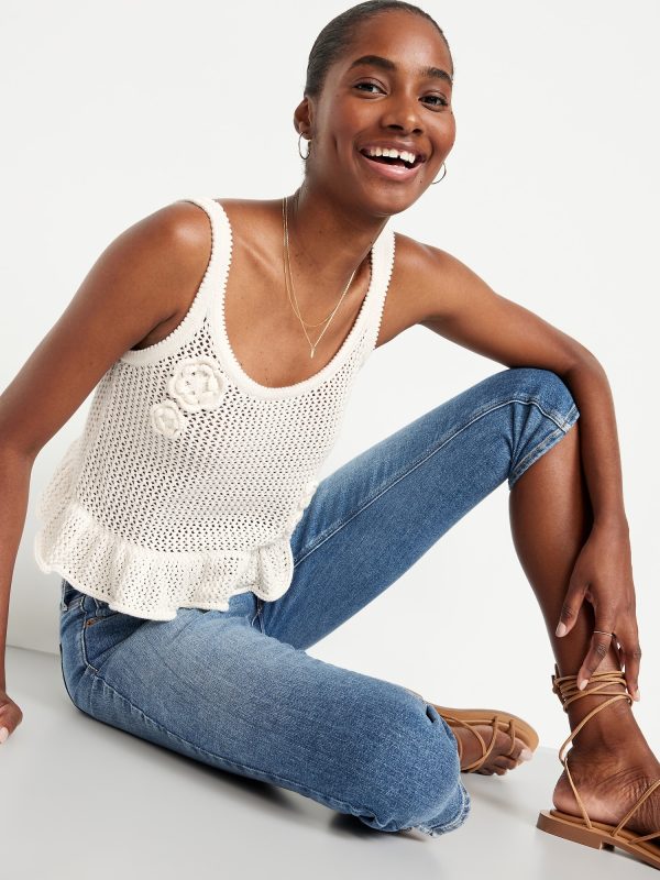 Sleeveless Open-Stitch Peplum Sweater: scoop neck, wide straps, floral appliqué accents, ruffled peplum hem, #761610