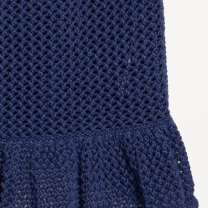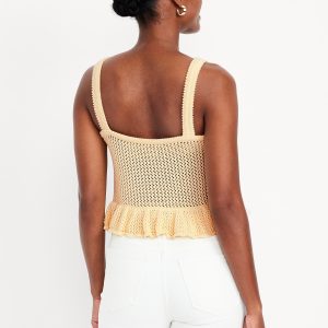 Sleeveless Open-Stitch Peplum Sweater: scoop neck, wide straps, floral appliqué accents, ruffled peplum hem, #761610