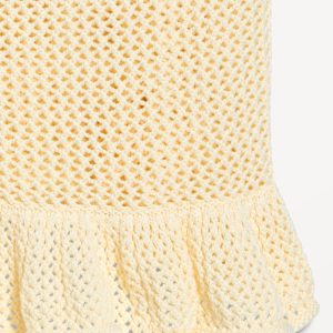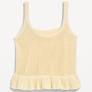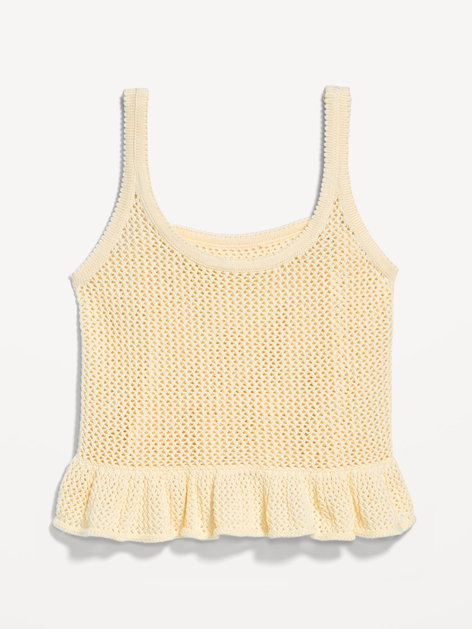 Sleeveless Open-Stitch Peplum Sweater: scoop neck, wide straps, floral appliqué accents, ruffled peplum hem, #761610