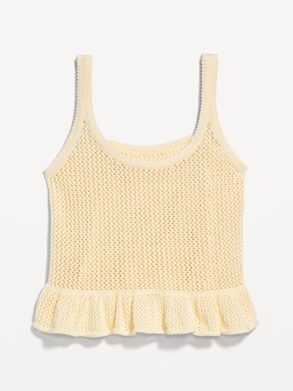 Sleeveless Open-Stitch Peplum Sweater: scoop neck, wide straps, floral appliqué accents, ruffled peplum hem, #761610