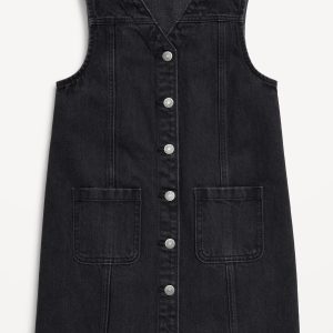 Sleeveless Pocket Jean Dress for Girls: v neck, sleeveless, patch pockets at front, full-length snap-button placket in sizes xs-m, full length regular button placket in sizes l-xxl, #803047