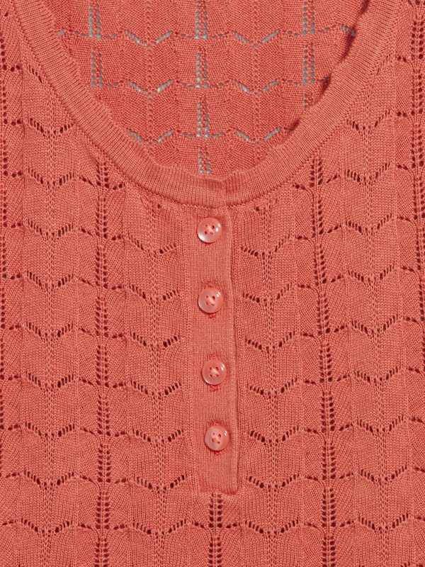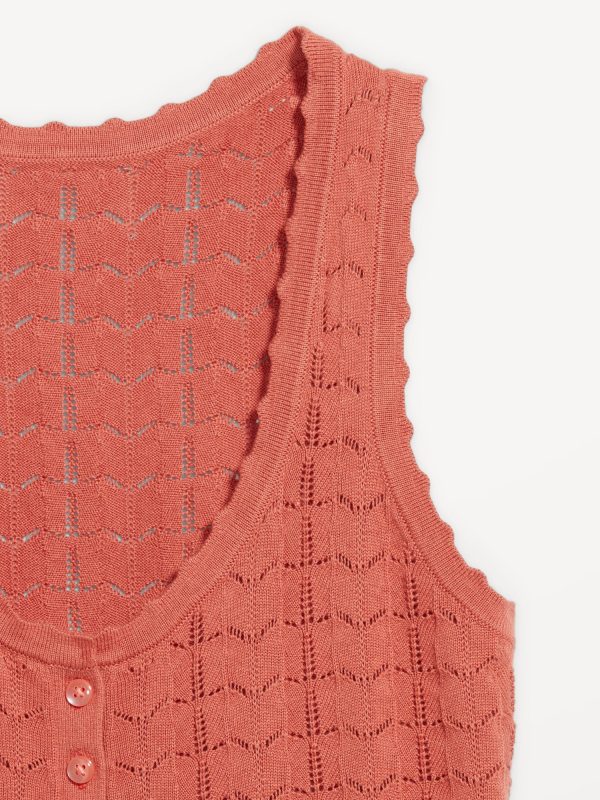Sleeveless Pointelle Cropped Henley Top: scoop neck, wide straps, button-henley placket, ruffled hem, #785032