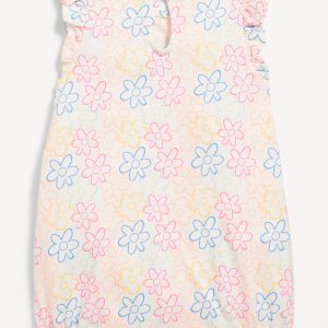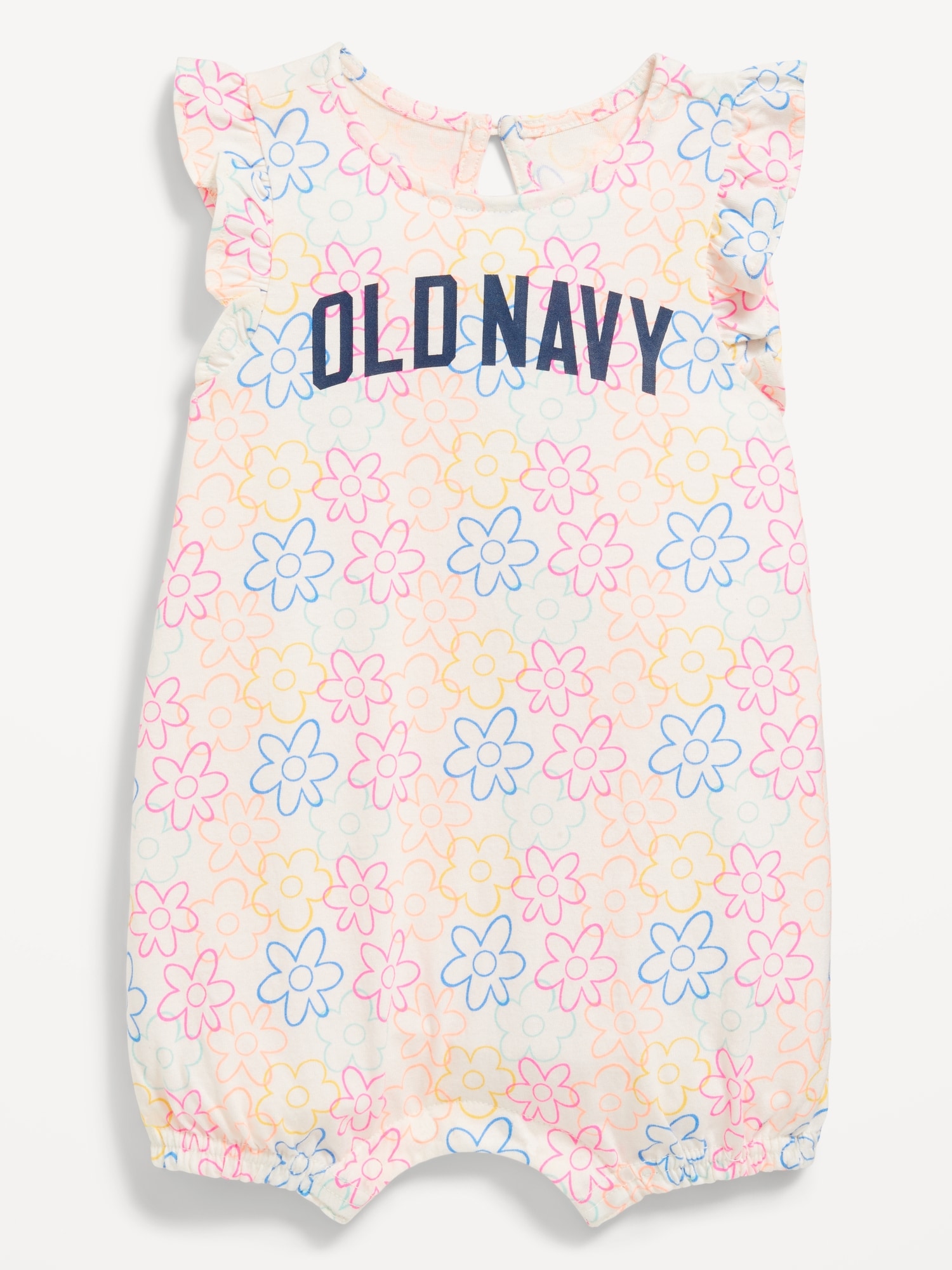 Sleeveless Printed Logo-Graphic One-Piece Romper for Baby: rounded neckline, keyhole cutout at nape, ruffle trim along arm openings, logo graphic, hidden snaps along inseam, all-over print, available exclusively online and at old navy outlet stores., #694153