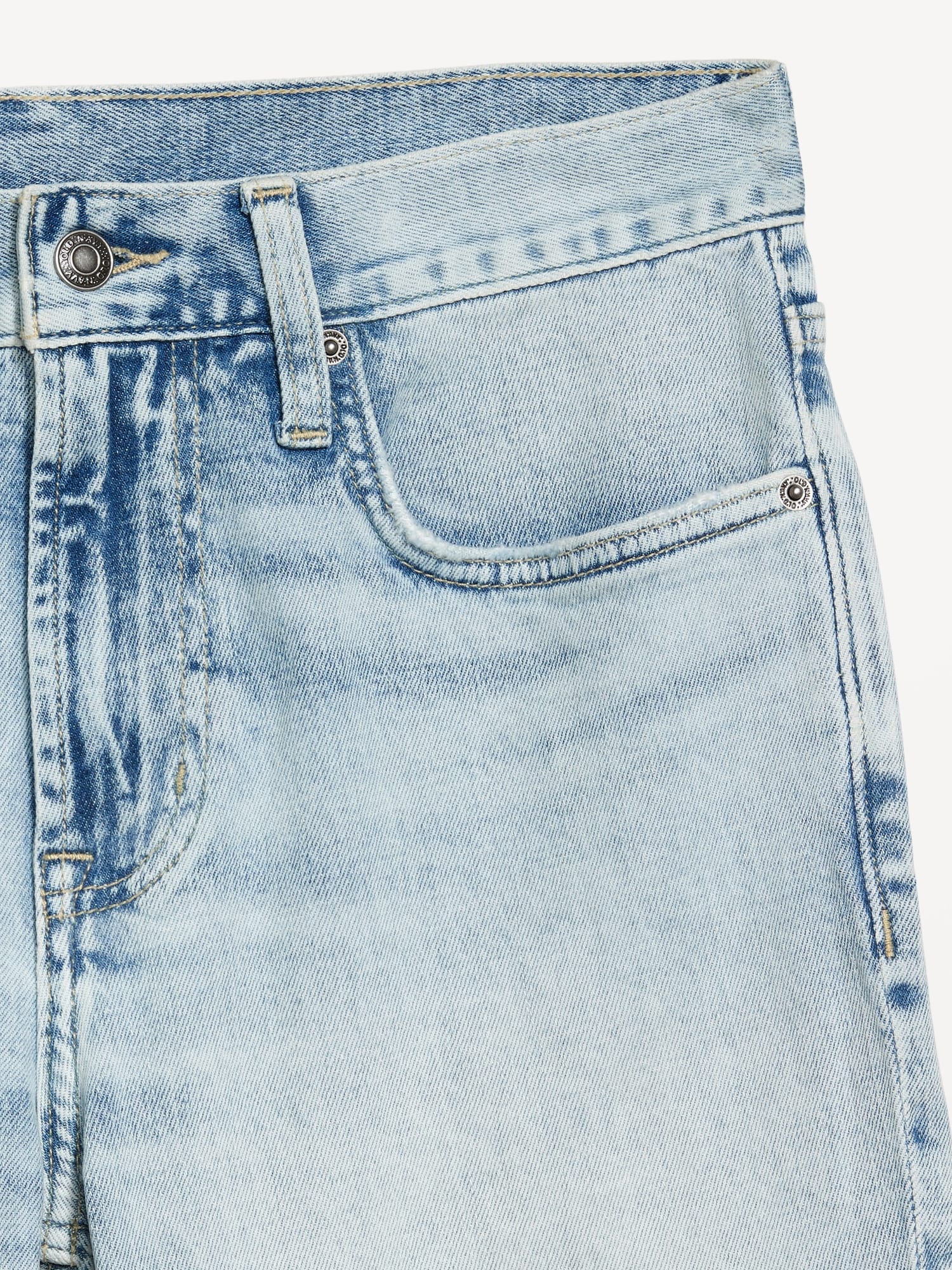 Slim Built-In Flex Jean Raw-Edge Shorts — 9.5-inch inseam: zip fly, front scoop pockets, back patch pockets, raw-edge hem, #683988