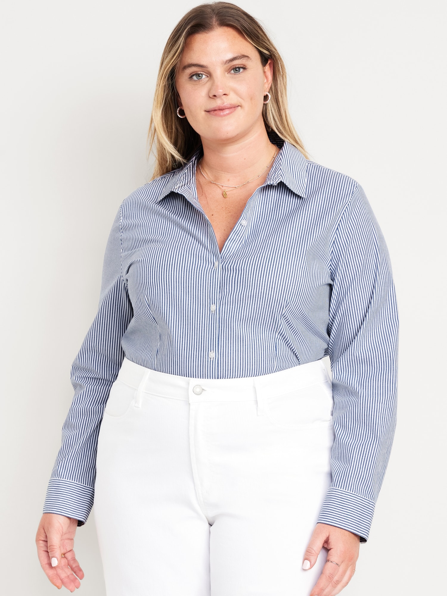 Slim Button-Down Shirt: spread collar, long sleeves, buttoned cuffs, button front, striped print, curved hem, #545902