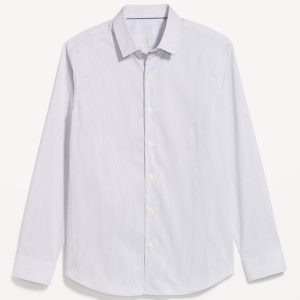 Slim Fit Pro Signature Performance Dress Shirt: 2″ pointed collar, built-in collar stays, long sleeves, buttoned cuffs, full-button front, breathable, quick drying, go-dry wicks moisture, #418103