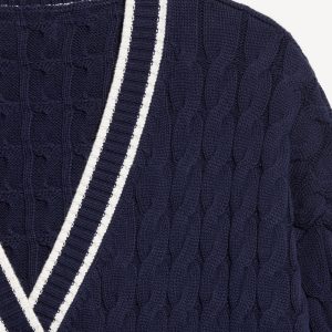 Slouchy Cable-Knit Cardigan Sweater: deep v-neck, long sleeves, button front, contrasting tipped trim, #784426
