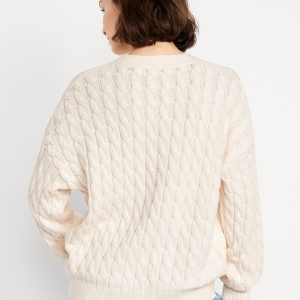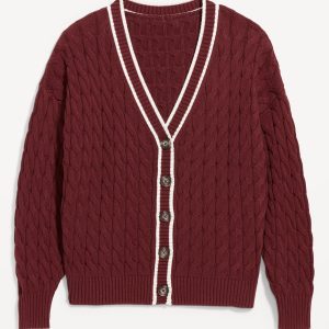 Slouchy Cable-Knit Cardigan Sweater: deep v-neck, long sleeves, button front, contrasting tipped trim, #784426