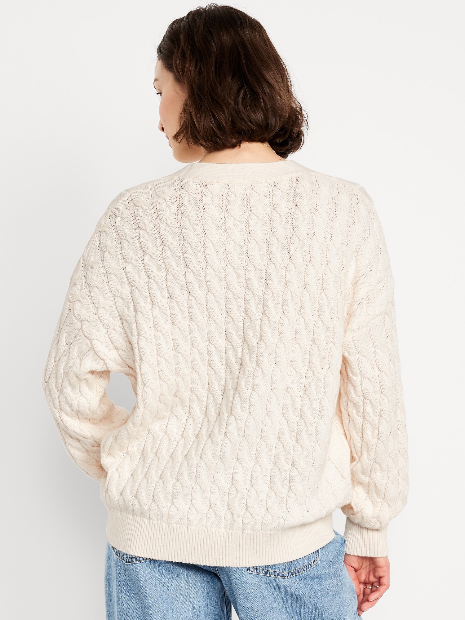 Slouchy Cable-Knit Cardigan Sweater: v-neck, long sleeves, button front, rib-knit trim, #761456