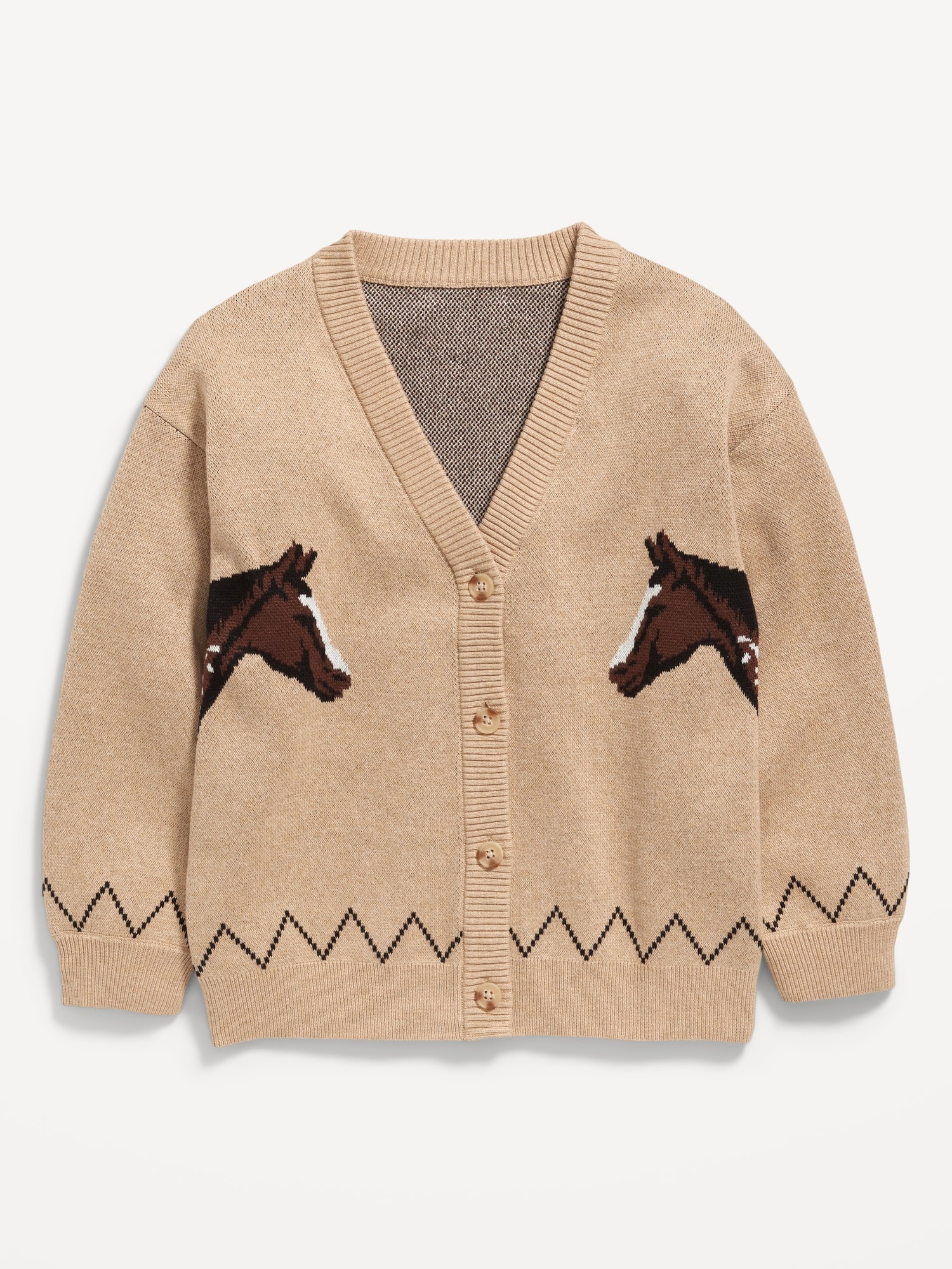 Slouchy Long-Sleeve Cardigan Sweater for Girls: v neck, long sleeves, drop shoulders, four-button placket, horse print at front, #787576