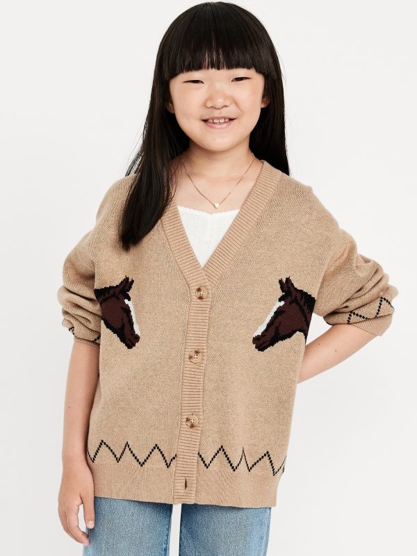 Slouchy Long-Sleeve Cardigan Sweater for Girls: v neck, long sleeves, drop shoulders, four-button placket, horse print at front, #787576