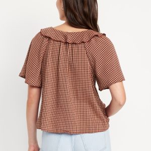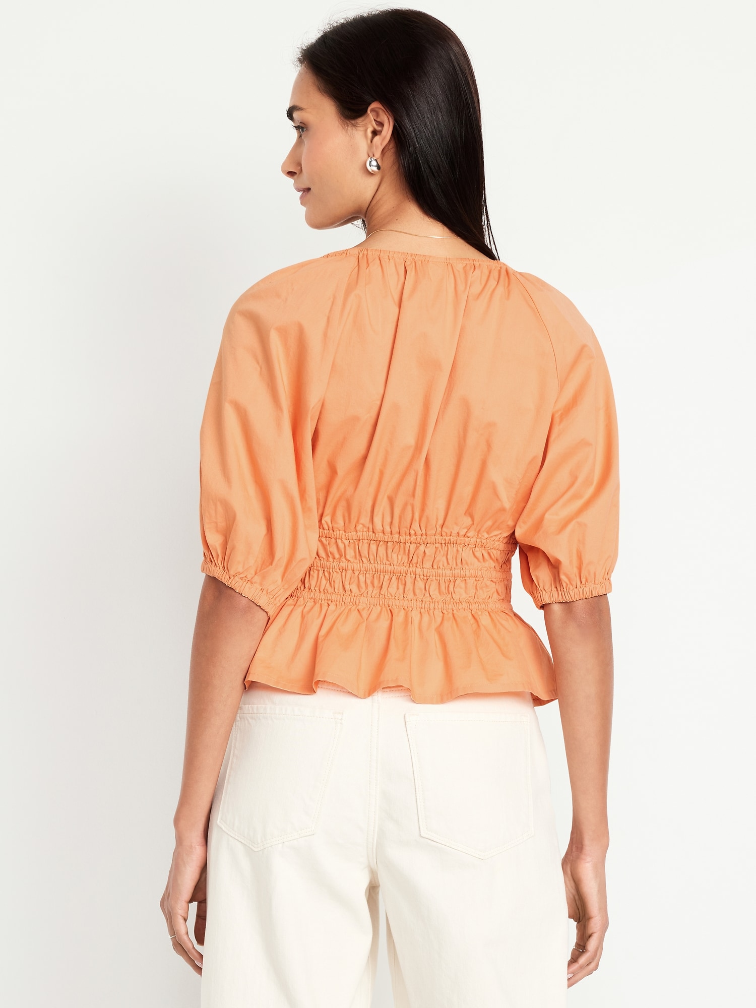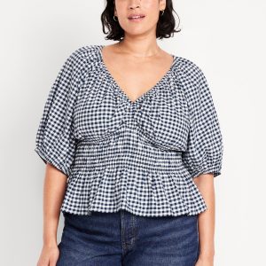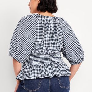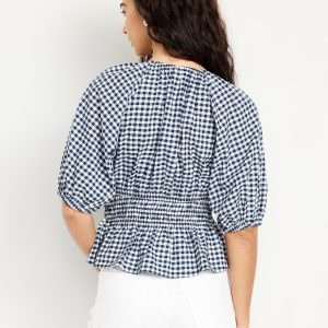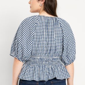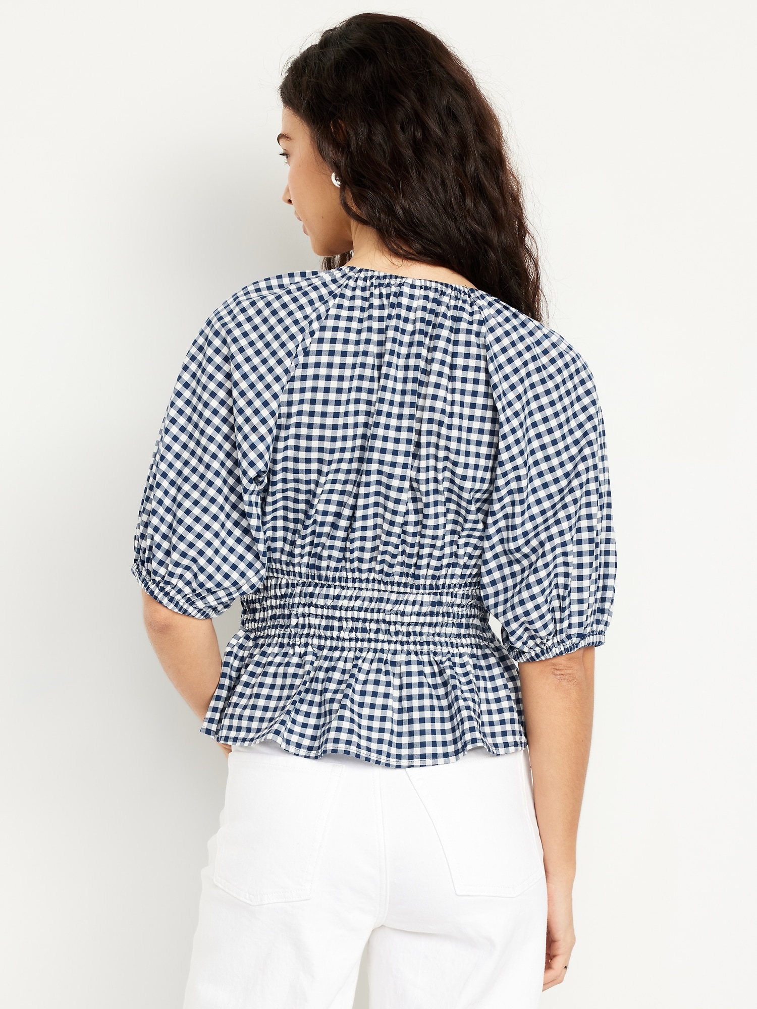Smocked Gingham Top: deep v-neck, elbow sleeves, elastic cuffs, smocked waist, peplum hem, gingham print, #704199
