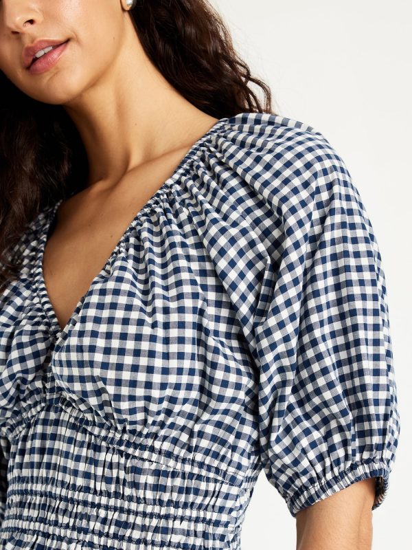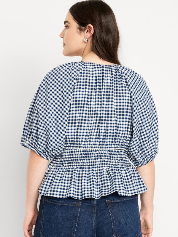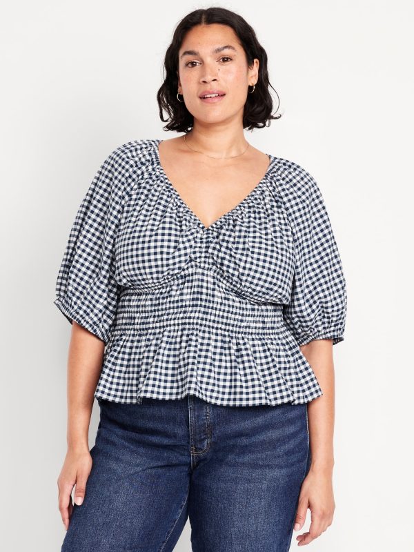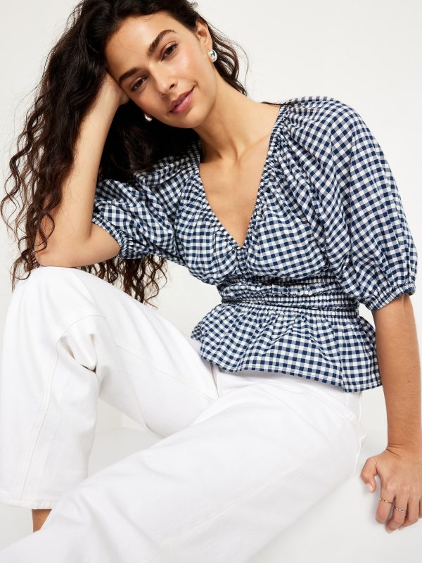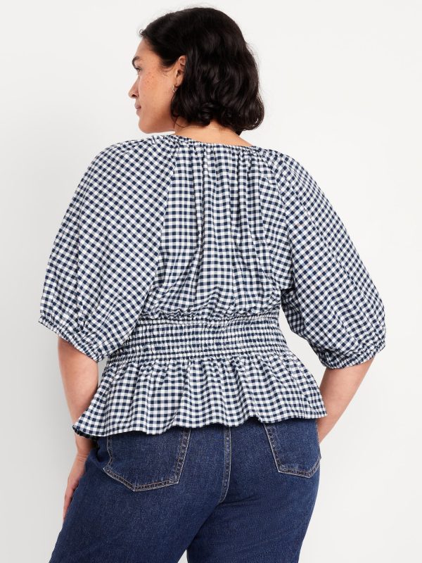 Smocked Gingham Top: deep v-neck, elbow sleeves, elastic cuffs, smocked waist, peplum hem, gingham print, #704199