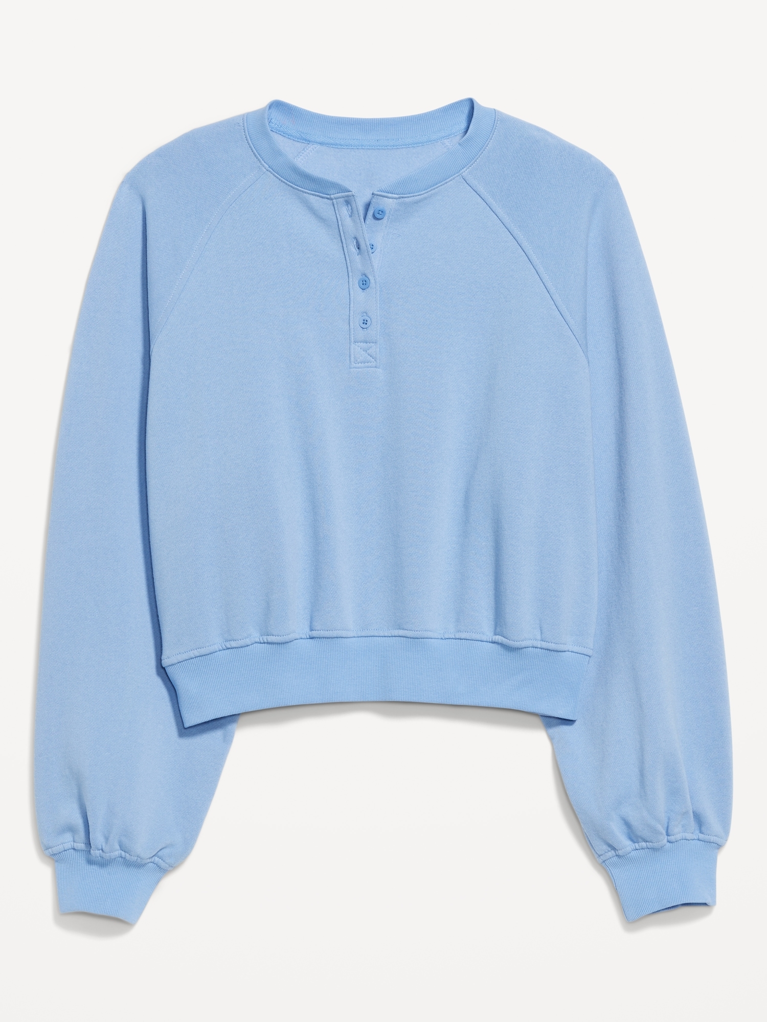 SoComfy Oversized Button-Front Sweatshirt: The perfect-weight, never-taking-this-off fleece.button-front crew neck, long blouson sleeves, rib-knit trim, pullover style, #764233