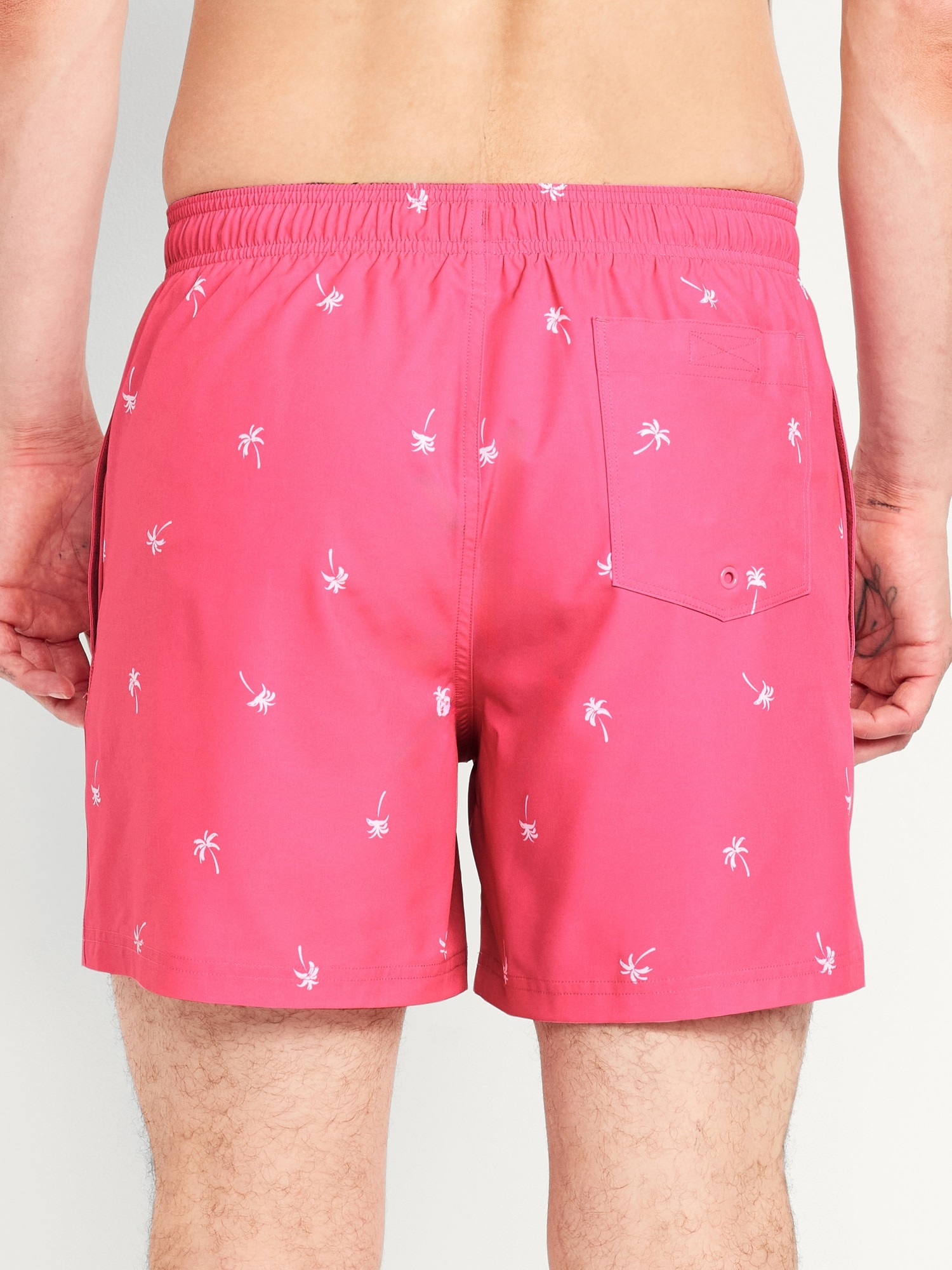 Solid Swim Trunks — 5-inch inseam: elastic-drawstring waistband, on-seam pockets, back pocket with grommet drain, built-in mesh briefs, pull-on style, all-over cocktail print, #766289