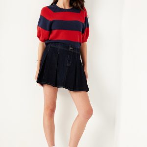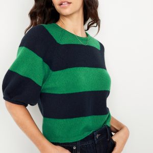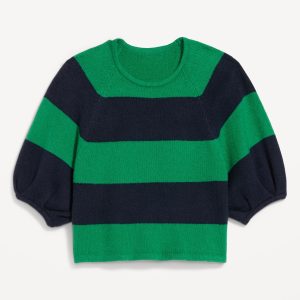 SoSoft Cropped Puff-Sleeve Sweater: Featuring SoSoft. Literally “so soft” it’s got cashmere jealous.crew neck, elbow-length puff sleeves, wide contrasting stripes, #761516
