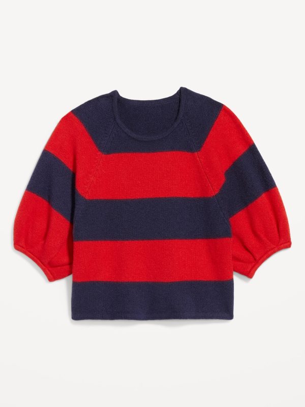 SoSoft Cropped Puff-Sleeve Sweater: Featuring SoSoft. Literally “so soft” it’s got cashmere jealous.crew neck, elbow-length puff sleeves, wide contrasting stripes, #761516