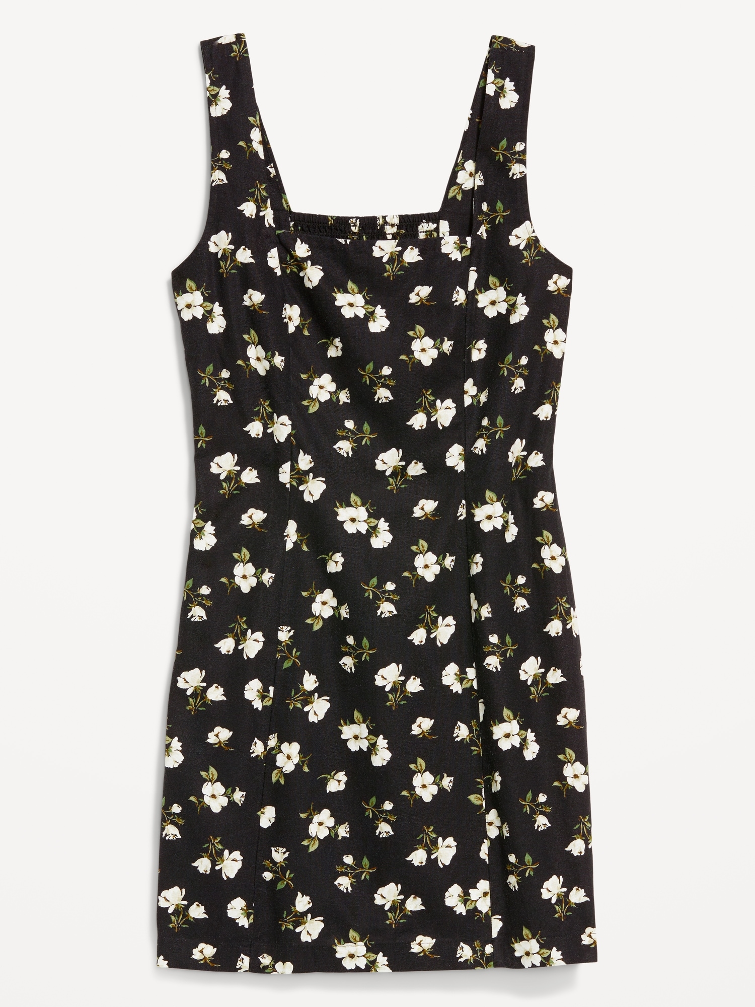 Square-Neck Linen-Blend Floral Mini Dress: square neck, wide straps, smocked back, princess seams, mini length, gingham print, #708450