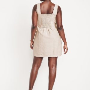 Square-Neck Linen-Blend Mini Dress: square neck, wide straps, smocked back, princess seams, mini length, gingham print, #708450