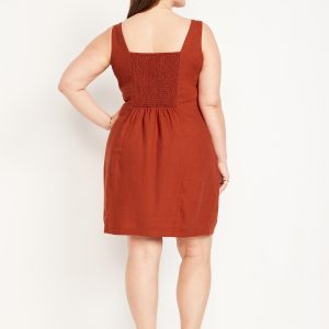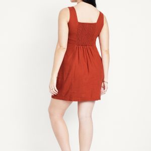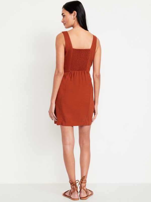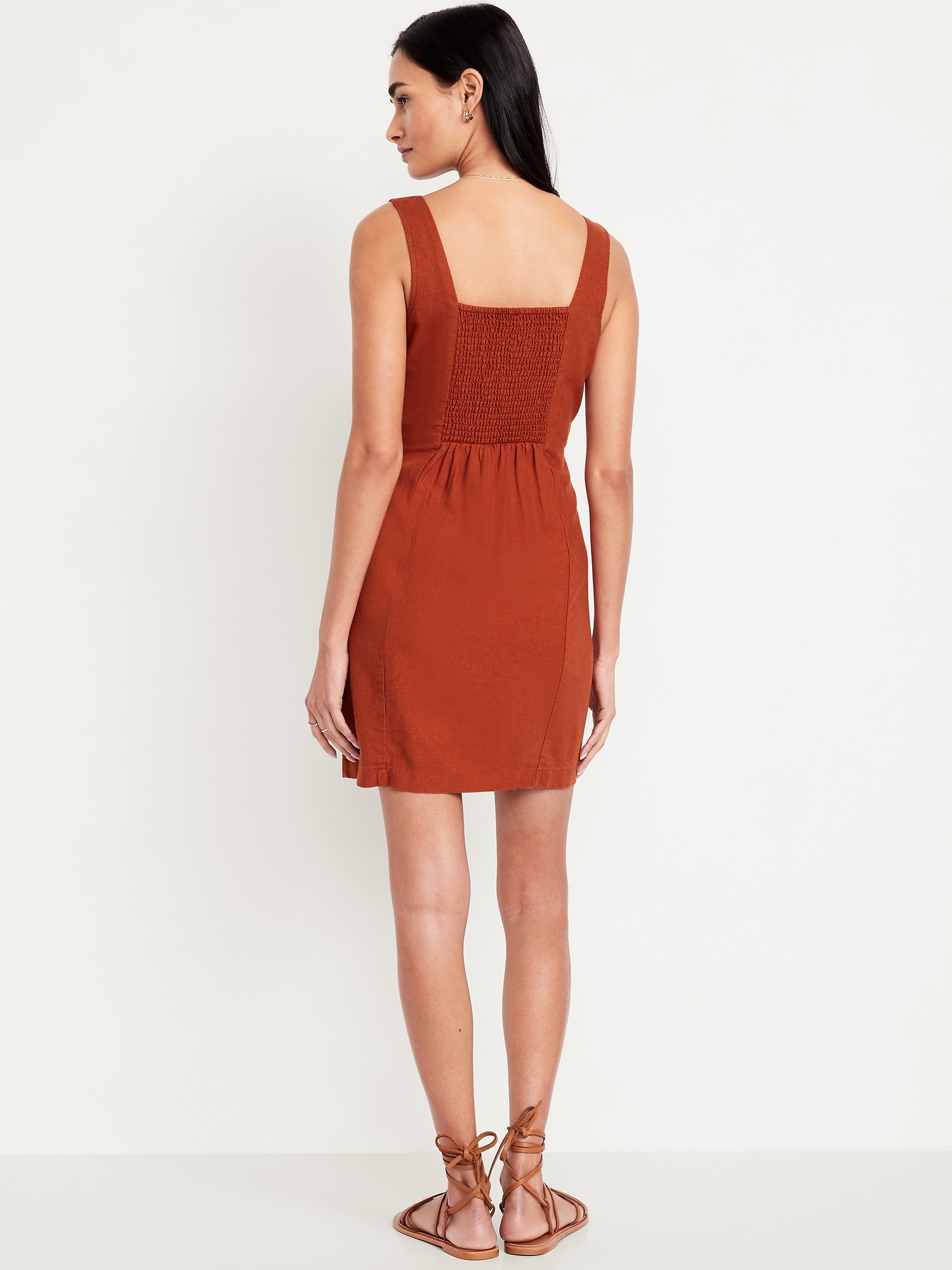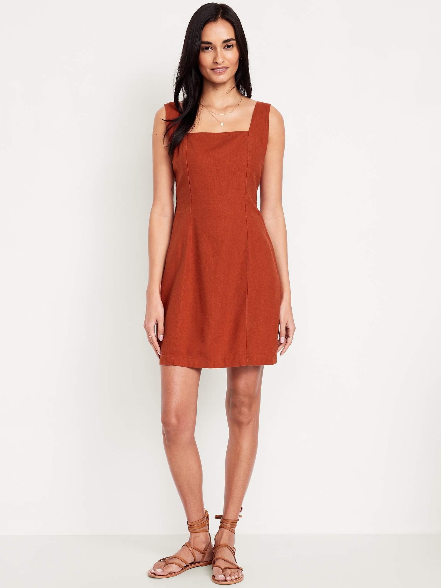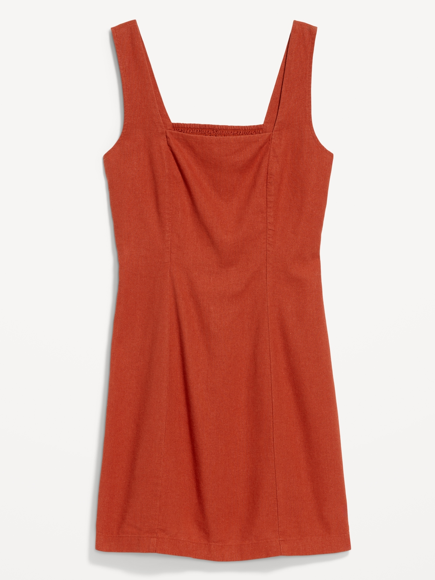 Square-Neck Linen-Blend Mini Dress: square neck, wide straps, smocked back, princess seams, mini length, gingham print, #708450