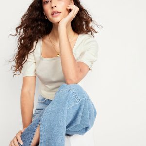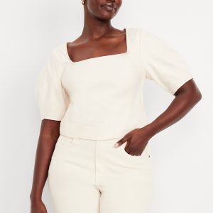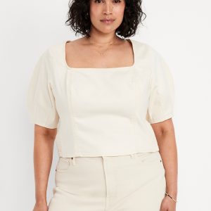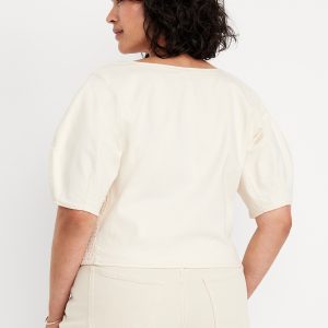 Square-Neck Seamed Denim Top: square neck, elbow-length darted sleeves, smocked side panels, princess seams, #805738