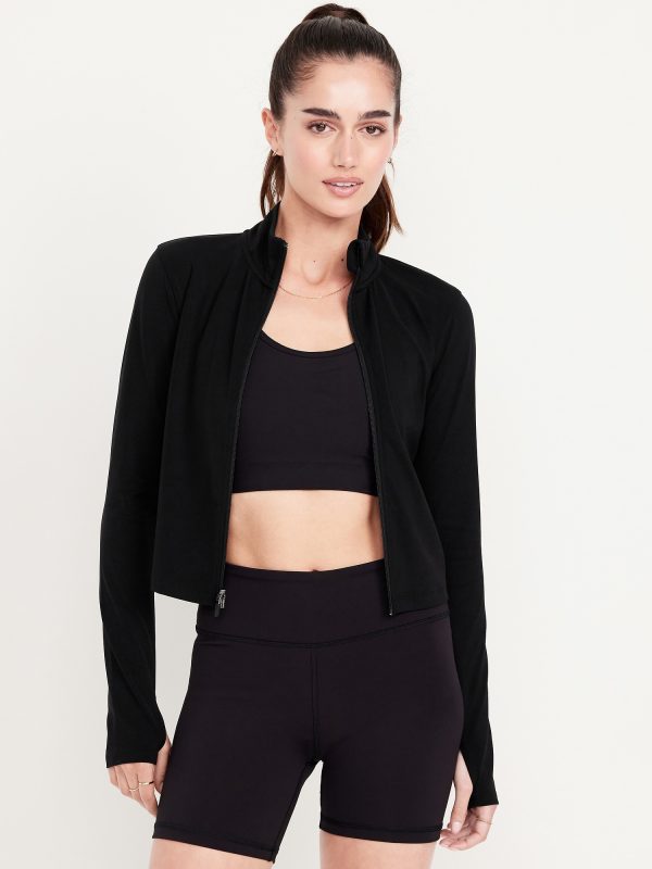 StudioSmooth Crop Full Zip: Featuring StudioSmooth. Buttery soft and breathable, with a barely-there feel.mock neck, long sleeves, thumbhole cuffs, zip front, go-dry wicks moisture, #663729