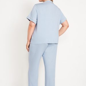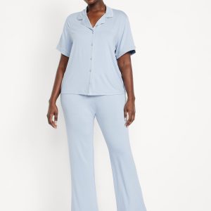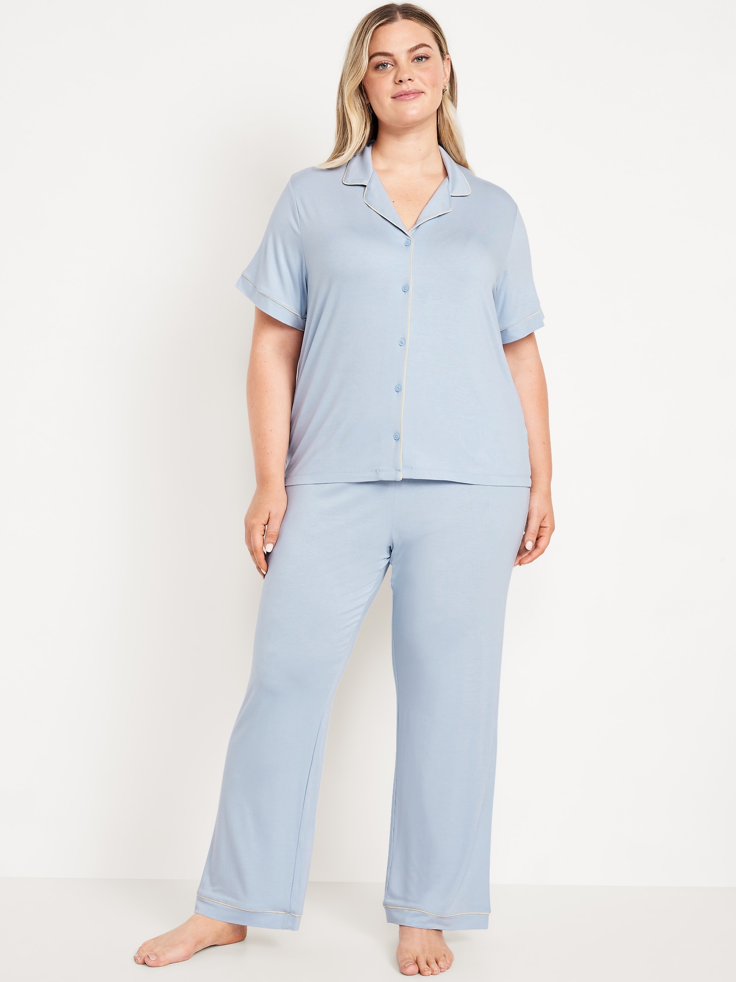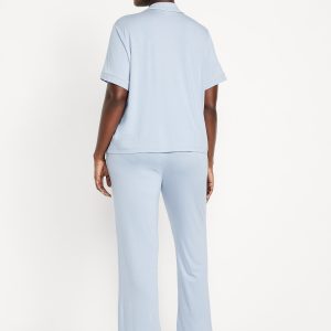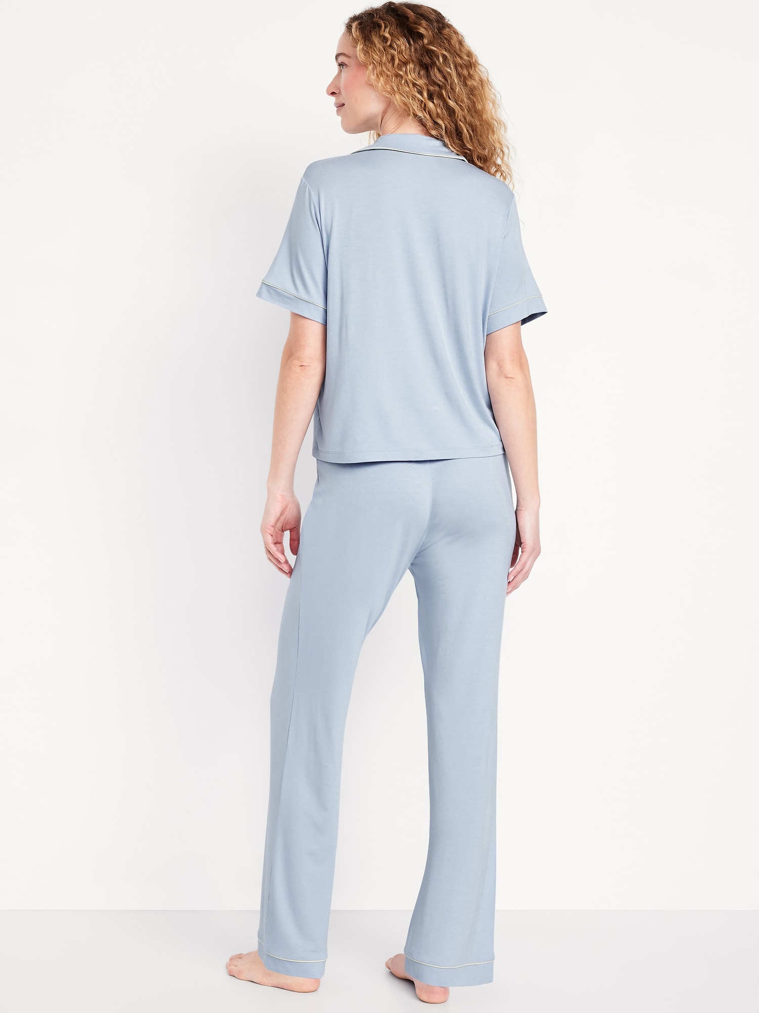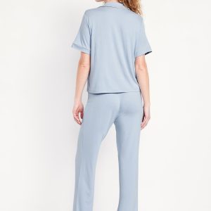 Sunday Sleep Knit Jersey Pant Set: set includes pajama shirt and matching bottoms, notched collar, short sleeves, button front, elastic-waist pajama pants with piping at hem, striped print, #808325