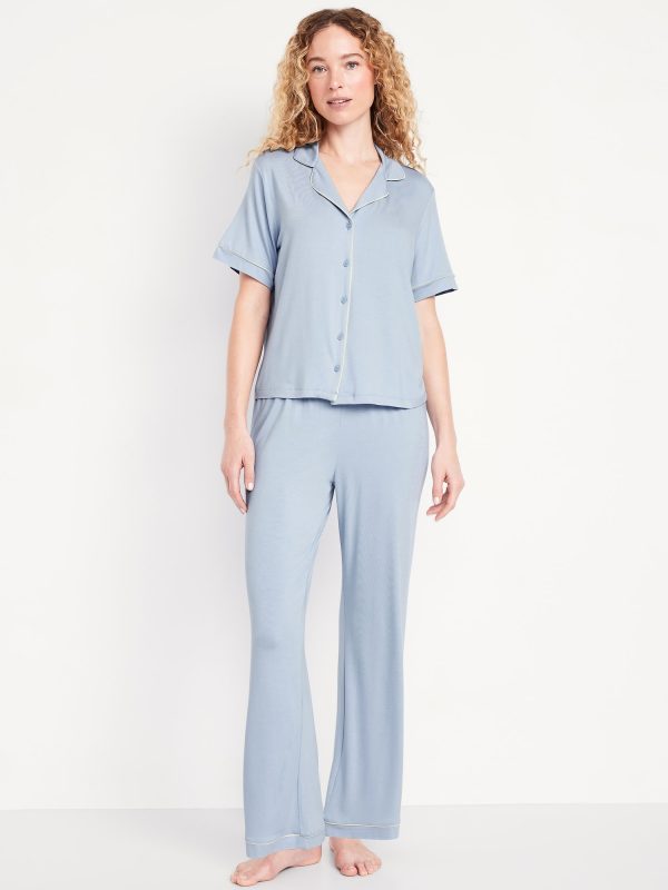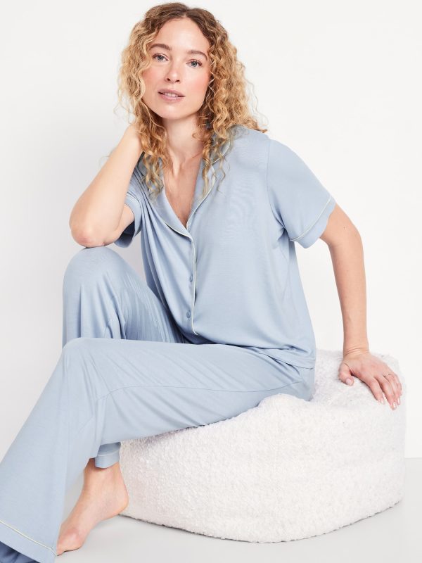 Sunday Sleep Knit Jersey Pant Set: set includes pajama shirt and matching bottoms, notched collar, short sleeves, button front, elastic-waist pajama pants with piping at hem, striped print, #808325