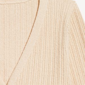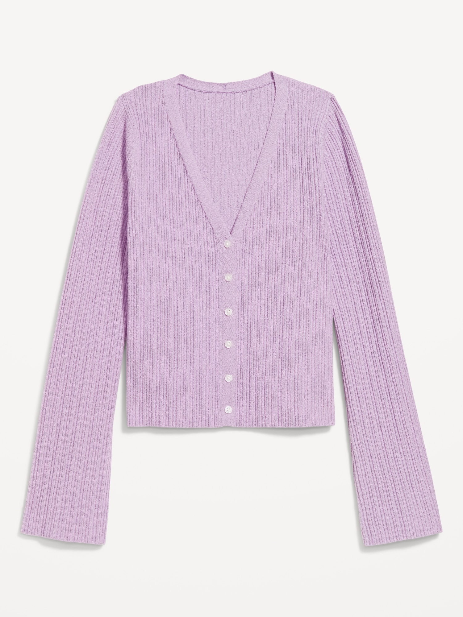 Textured Bouclé Button-Down Sweater: deep v-neck, long bell sleeves, button front, #761519