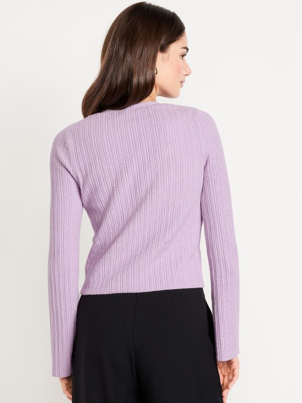 Textured Bouclé Button-Down Sweater: deep v-neck, long bell sleeves, button front, #761519