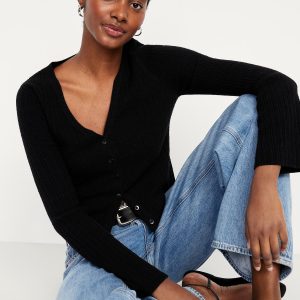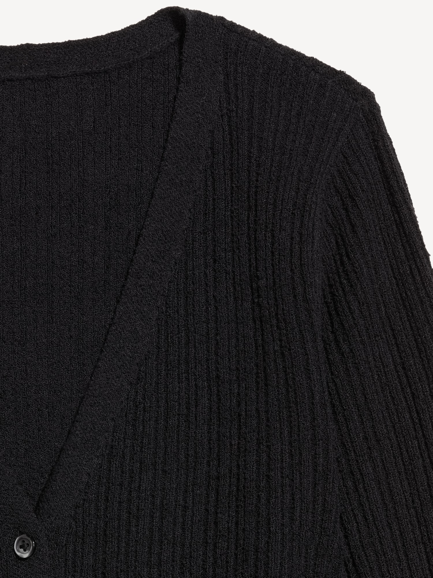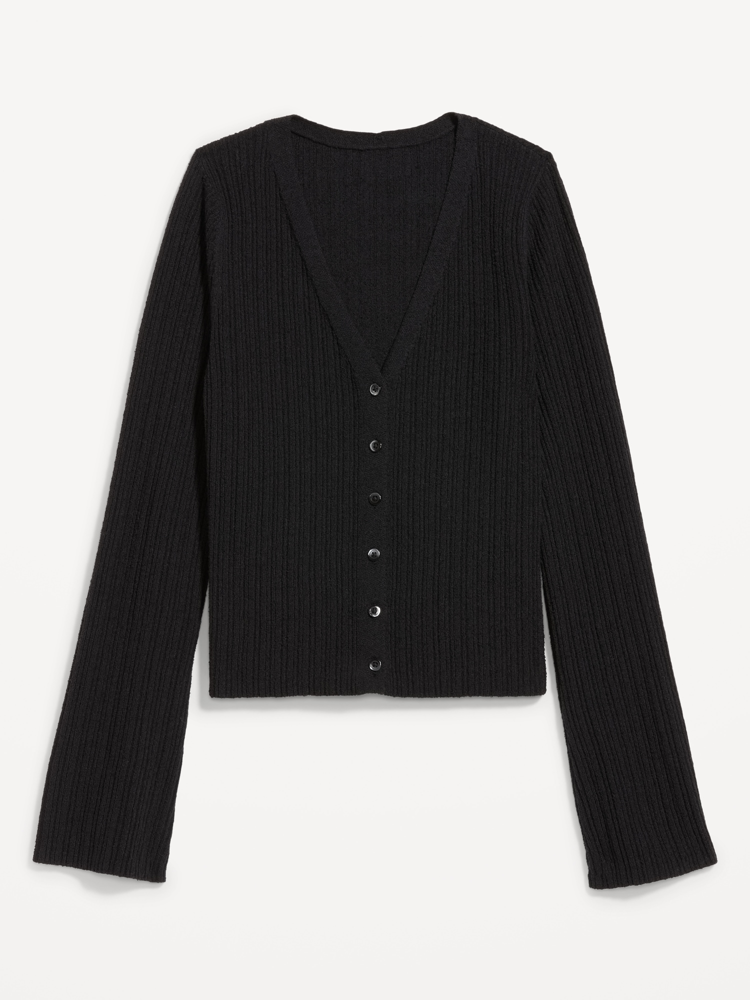 Textured Bouclé Button-Down Sweater: deep v-neck, long bell sleeves, button front, #761519