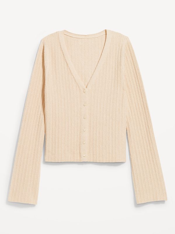 Textured Bouclé Button-Down Sweater: deep v-neck, long bell sleeves, button front, #761519