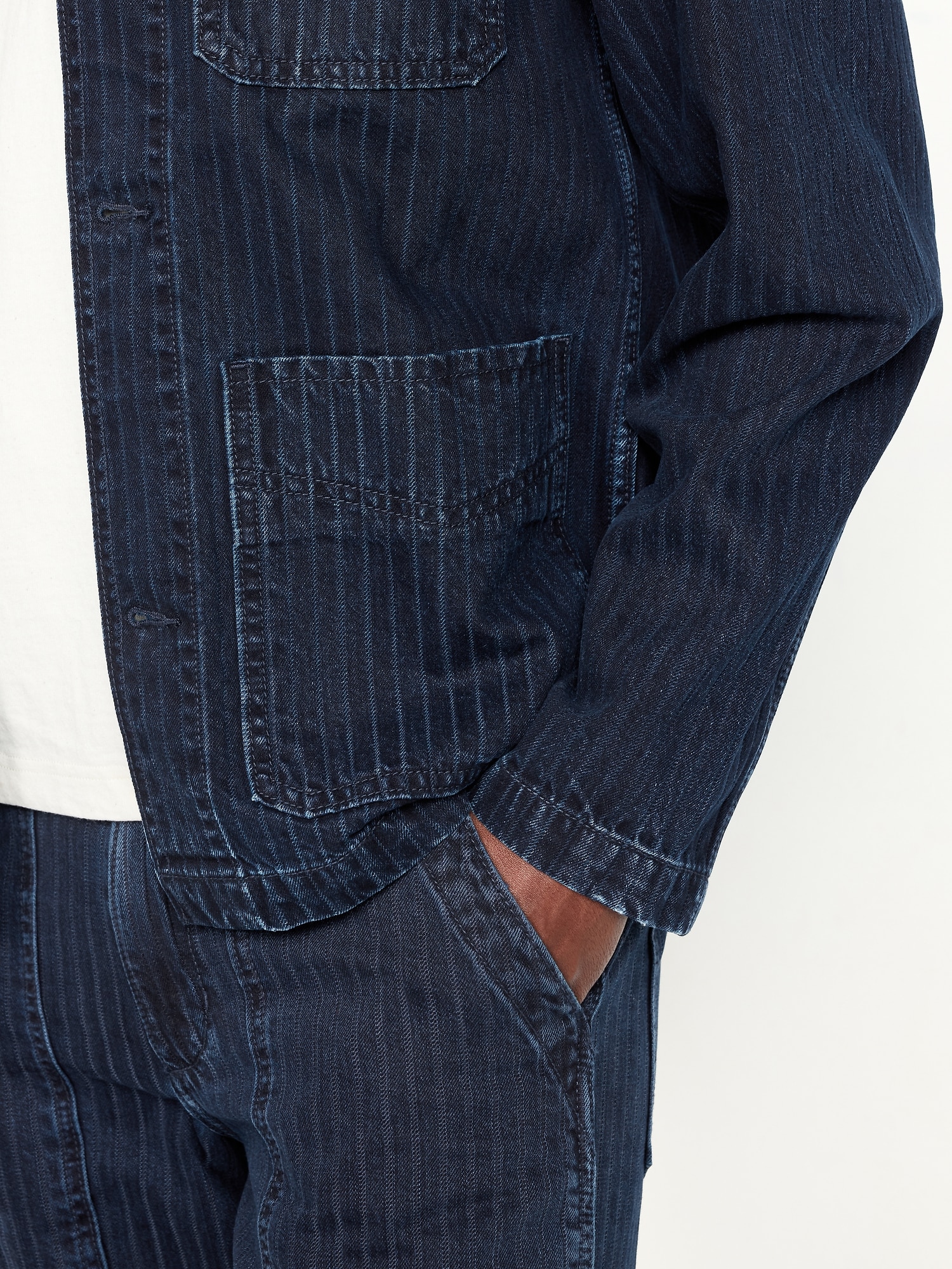 Textured-Stripe Denim Chore Jacket: spread collar, long sleeves, four-button front, chest patch pocket, front patch pockets, #800286